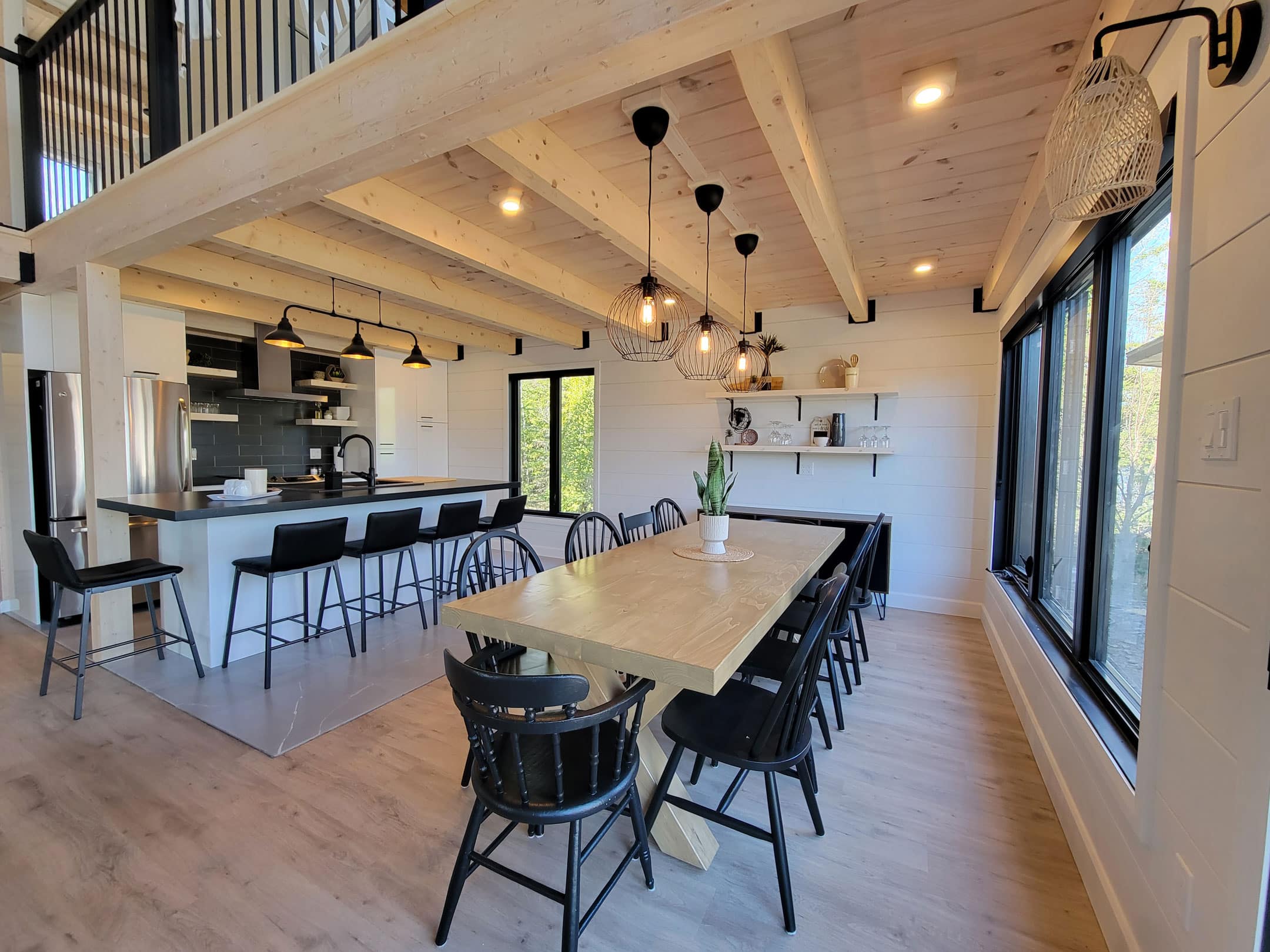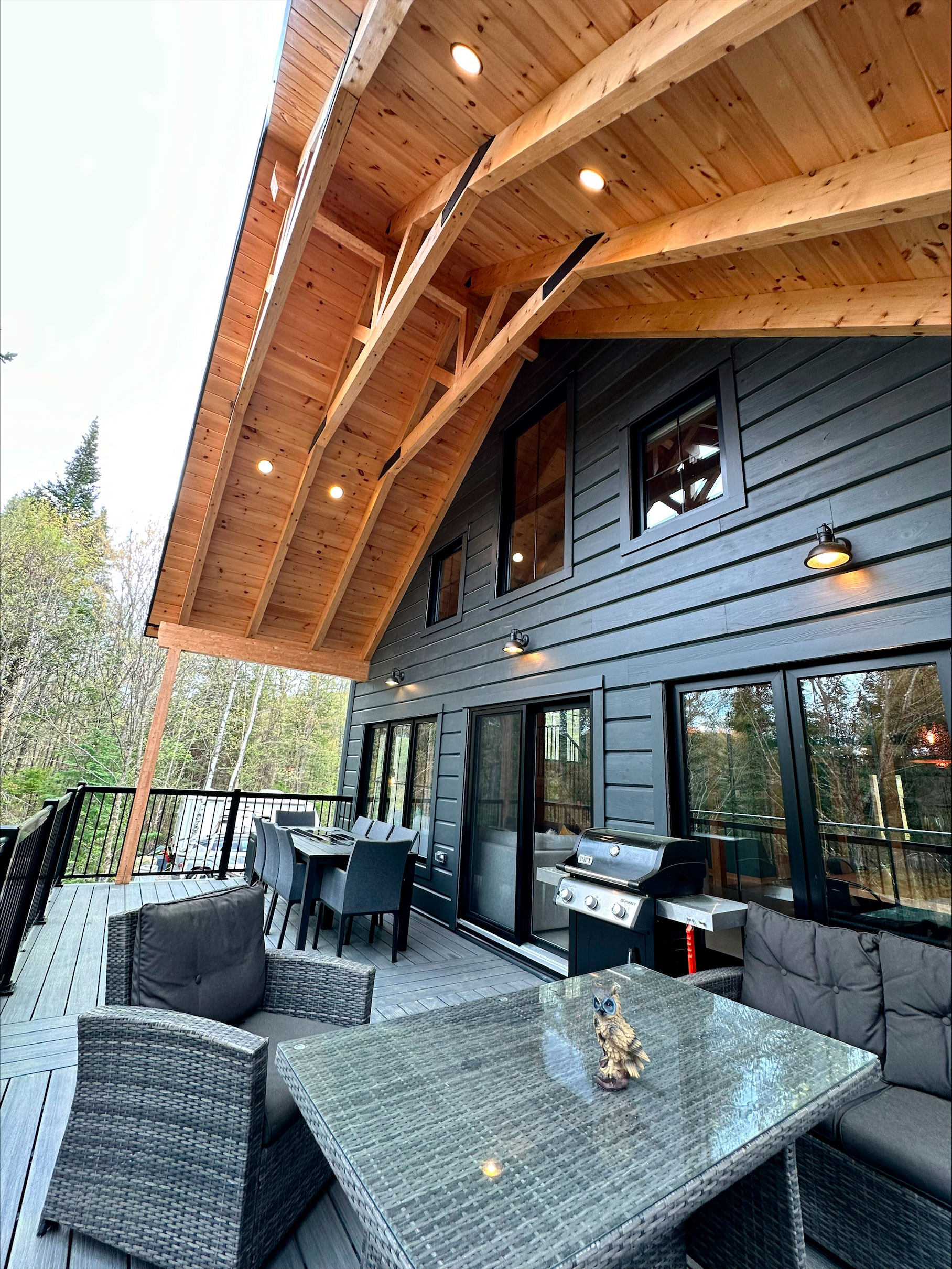 - Complete structure with exposed beams and white pine tongue-and-groove ceiling.