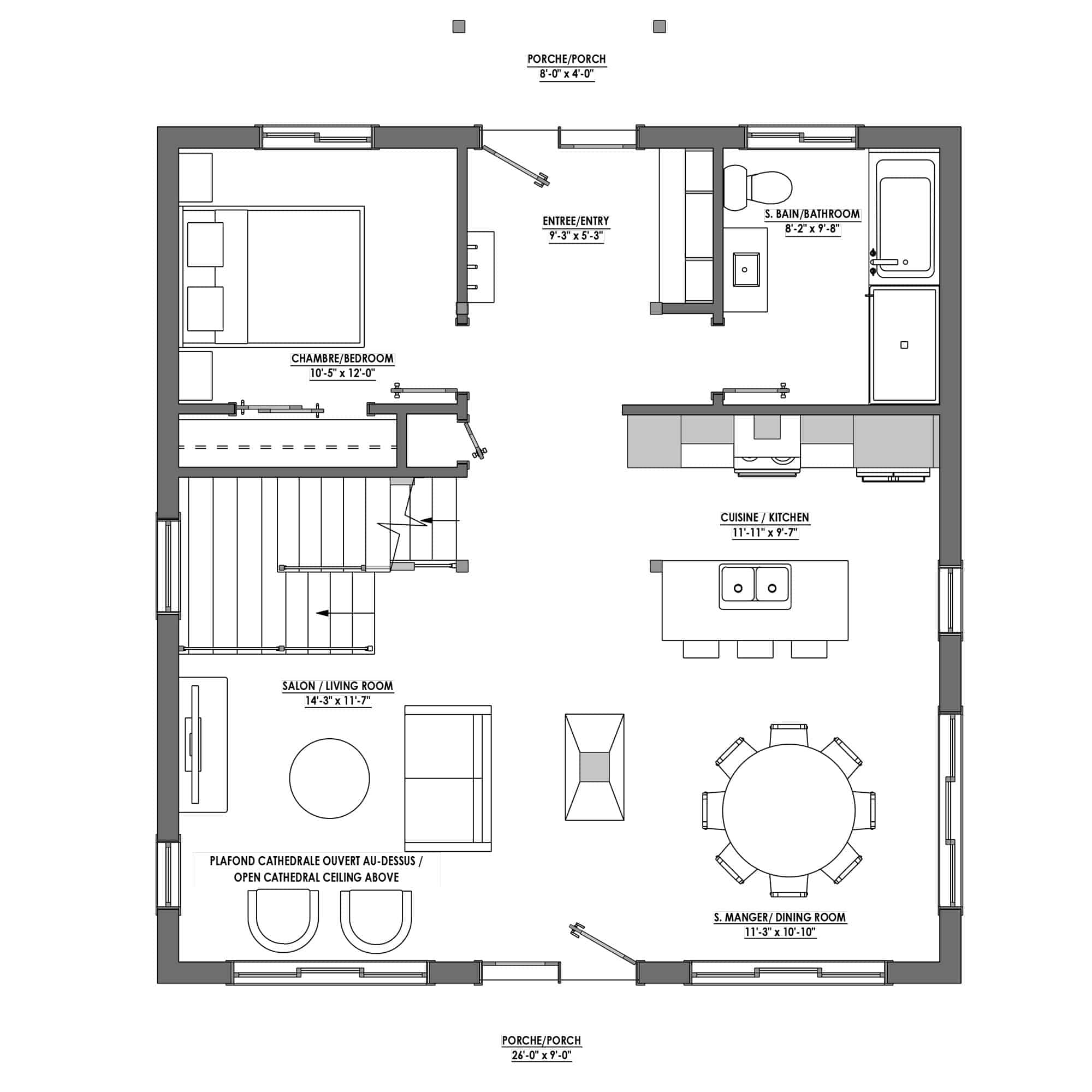 - Unique Design: Front porch (26’ x 9’), 8’ wide dormer.