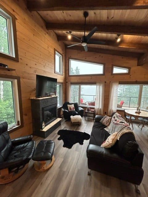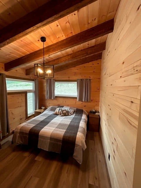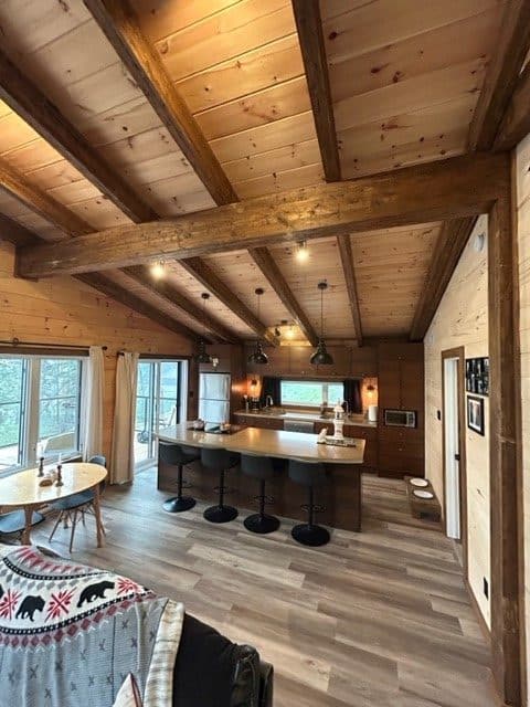 - Complete structure with exposed beams and white pine tongue-and-groove ceiling.