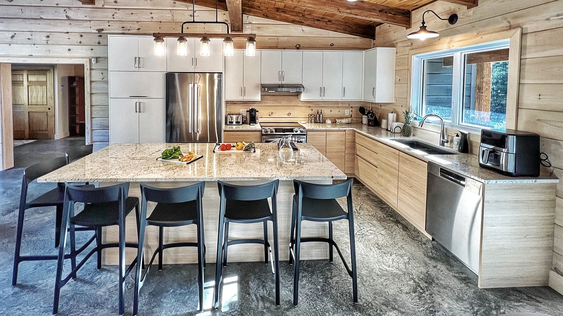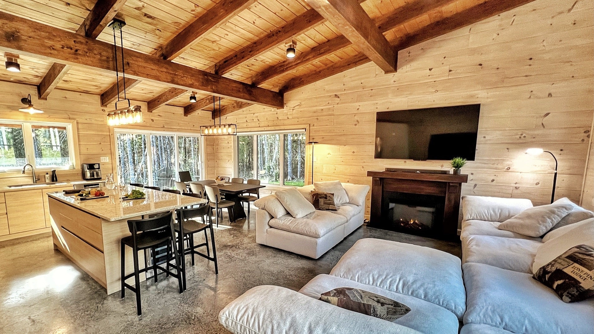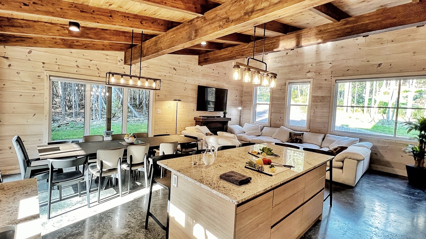 - Complete structure with exposed beams and white pine tongue-and-groove ceiling.