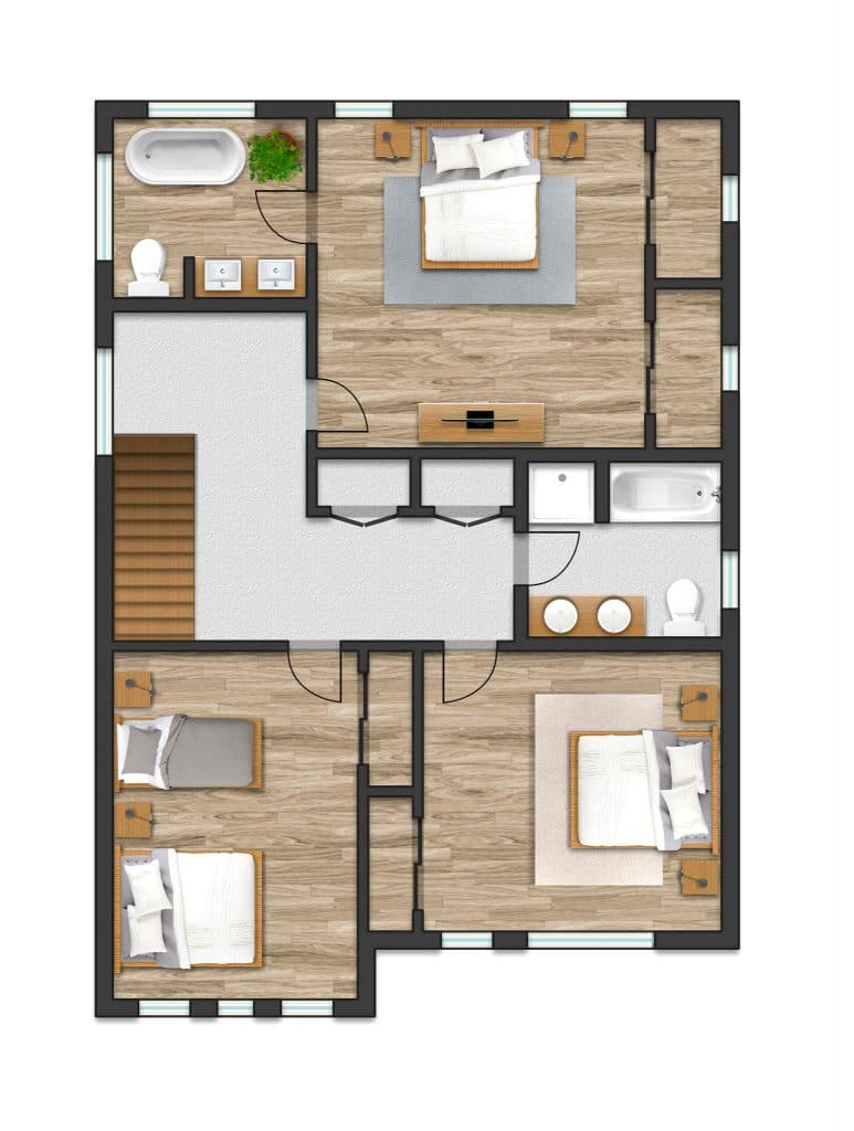 - Exposed Structures: Full upper floor (main section), roof, side porch, and front/rear porches with exposed beams.
