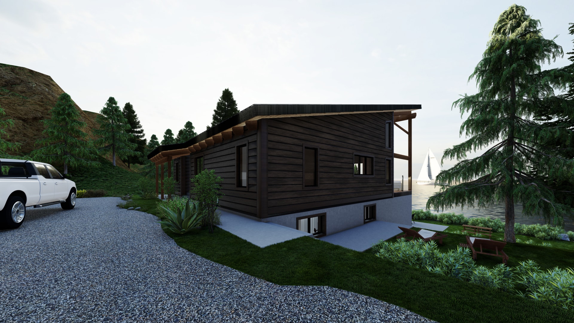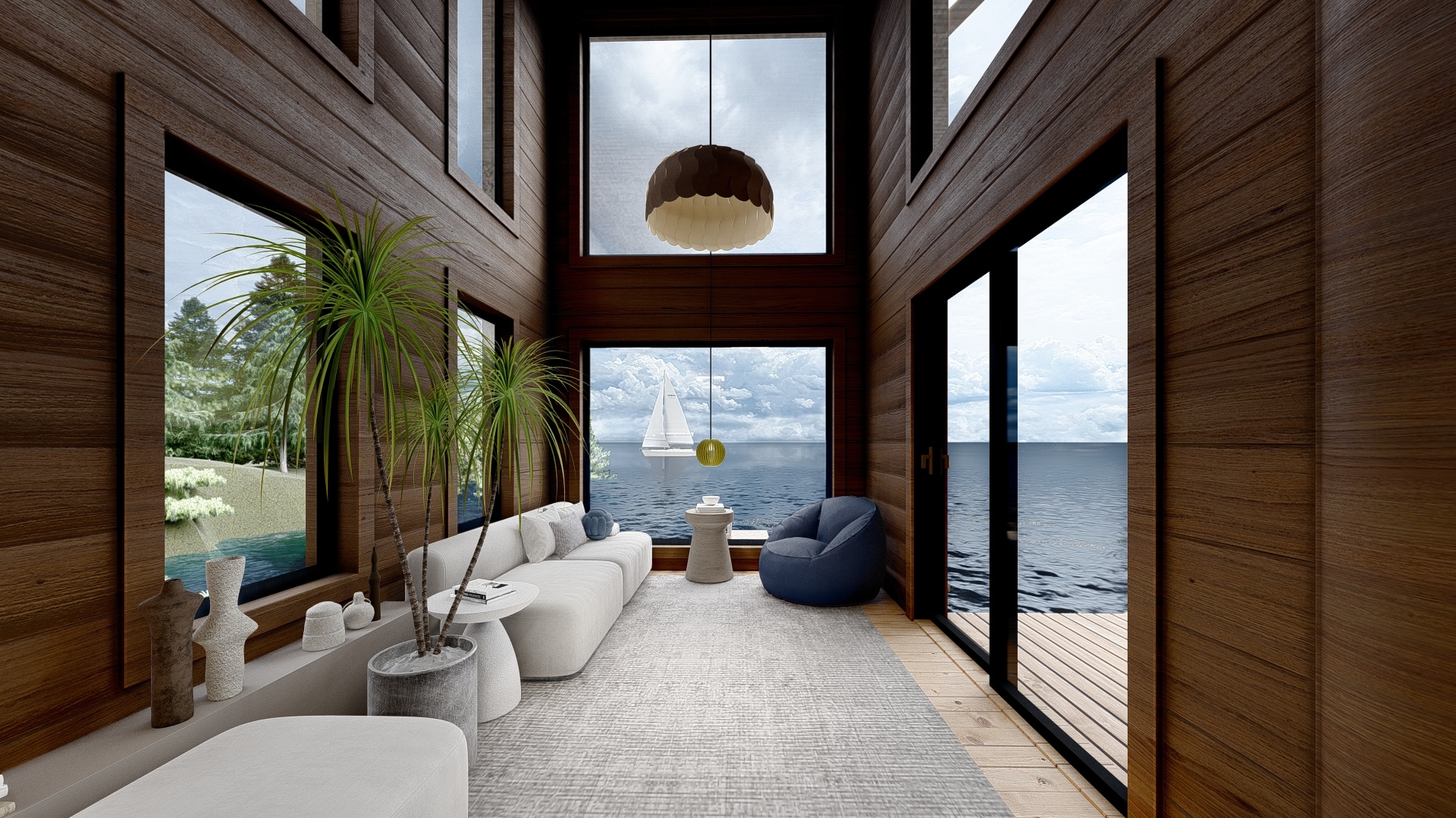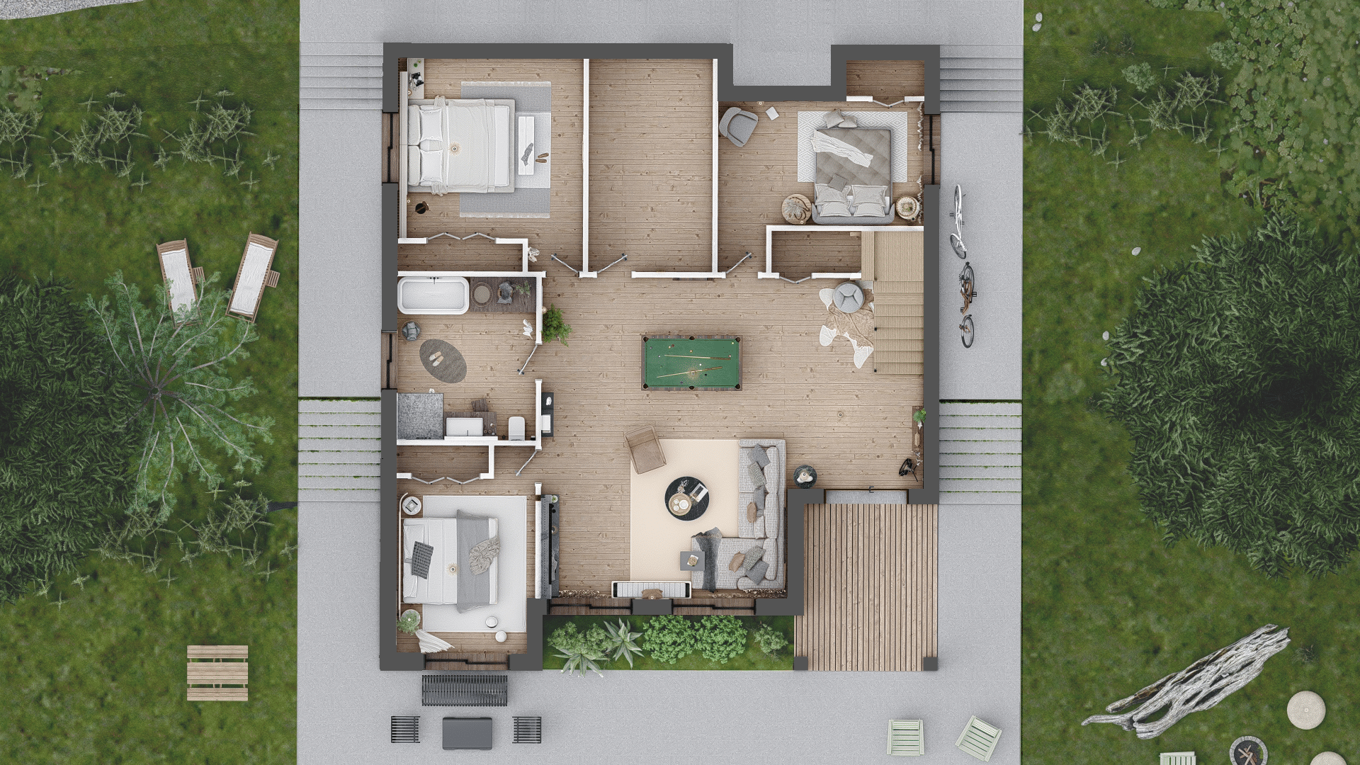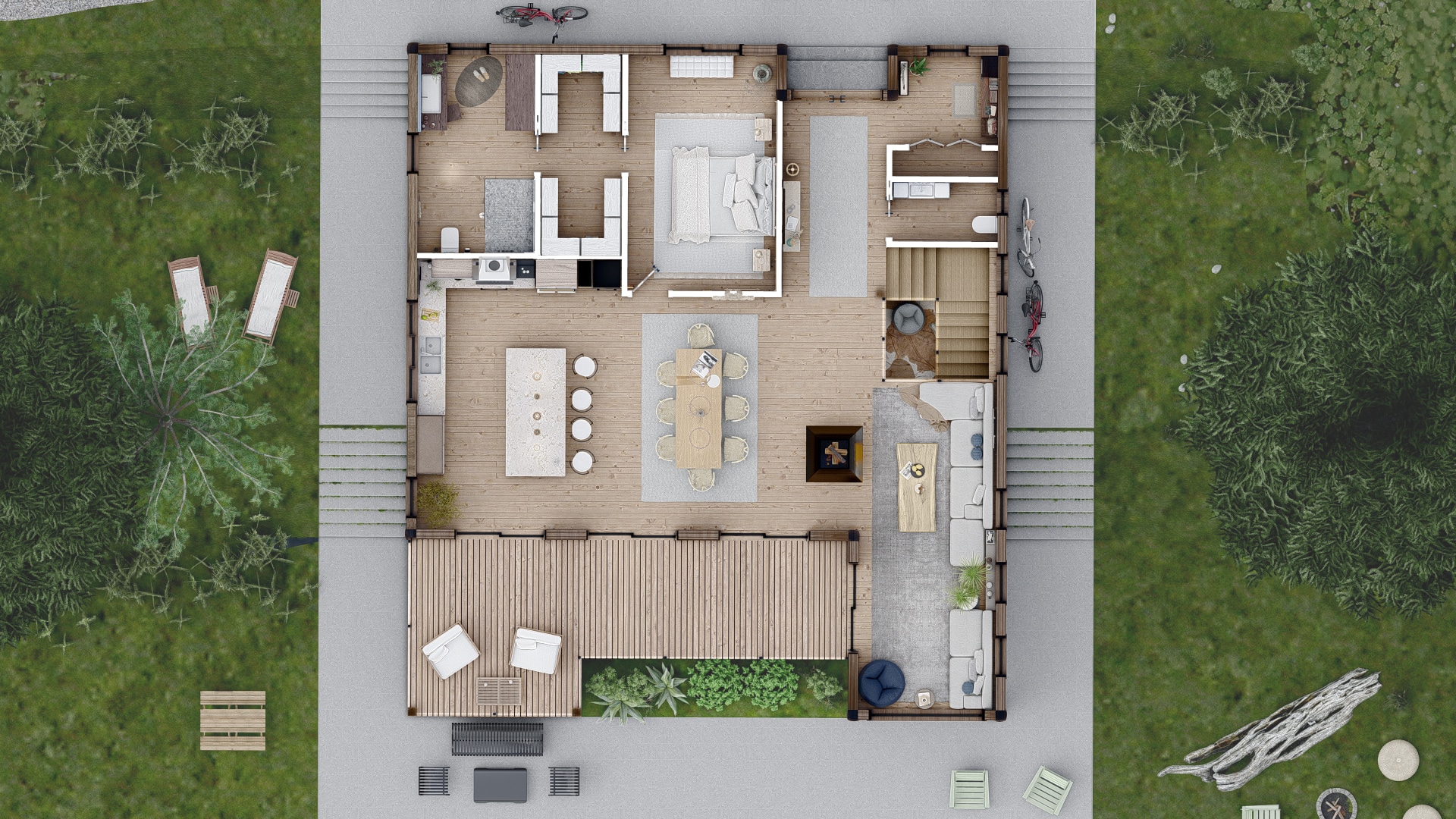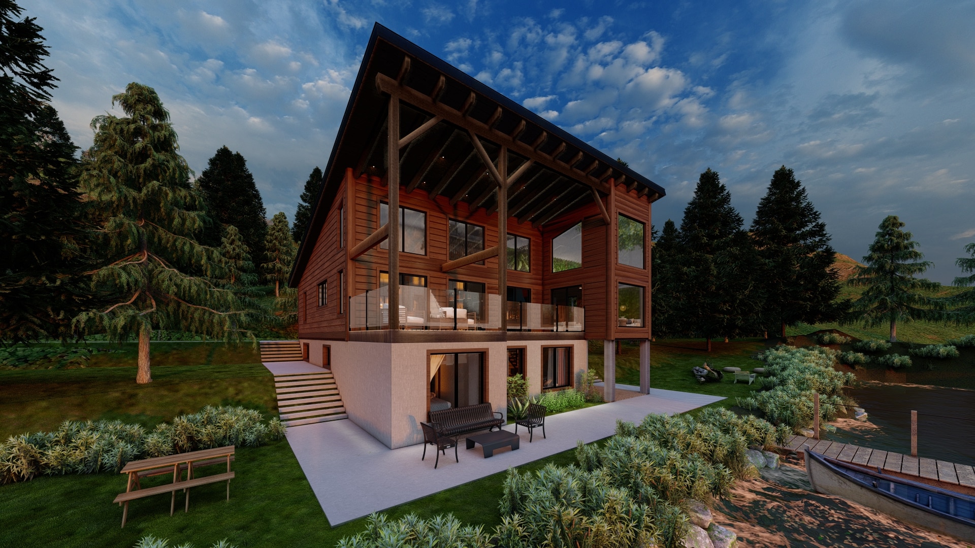 - Exposed Structures: Covered deck, roof, and porch with exposed beams.