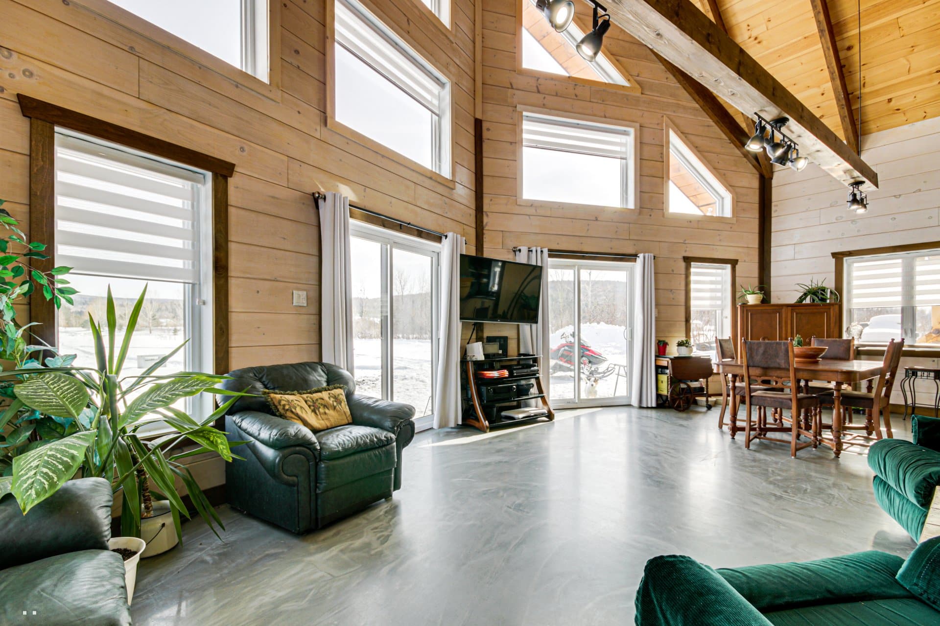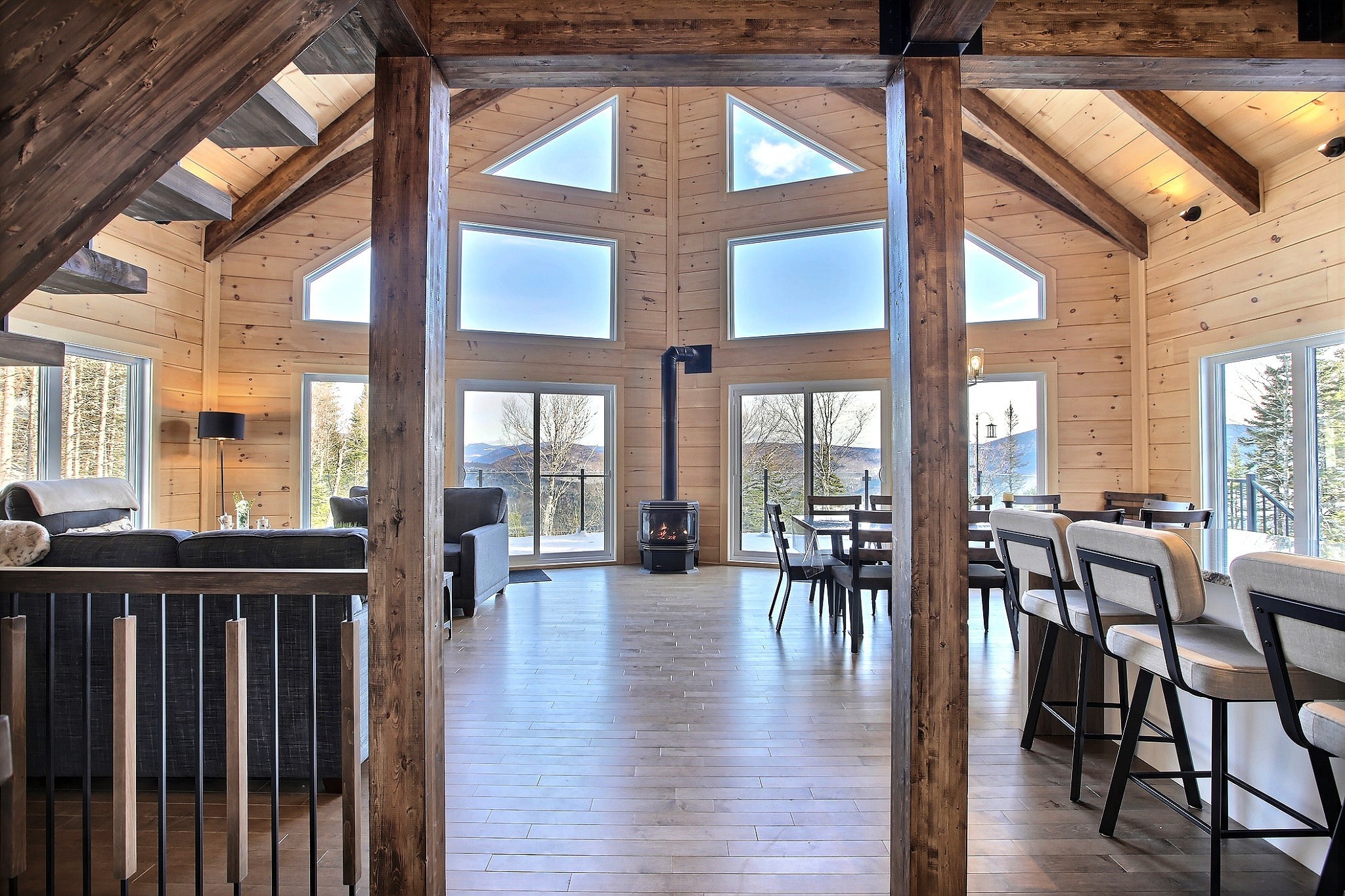 - Complete structure with exposed beams and white pine tongue-and-groove ceiling.