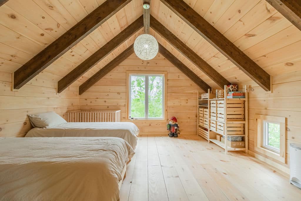 - Poutres apparentes, revêtement de plafond en pin embouveté.
