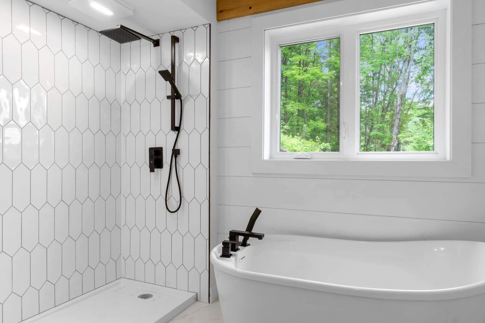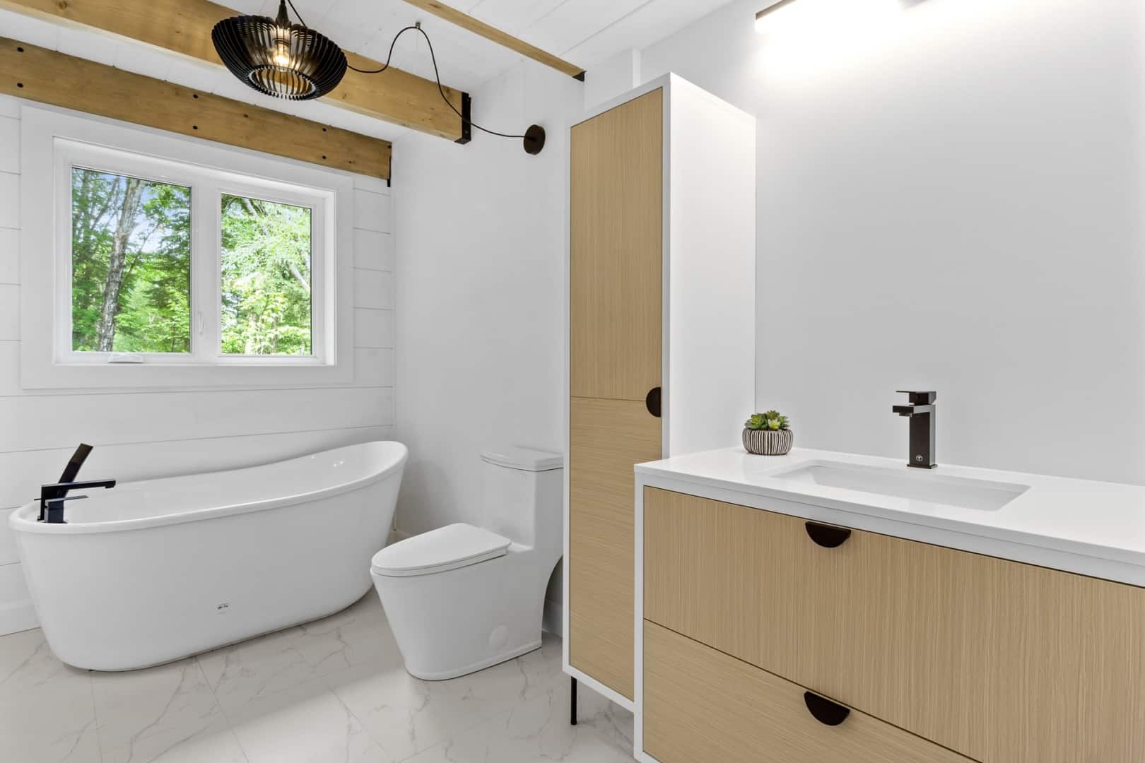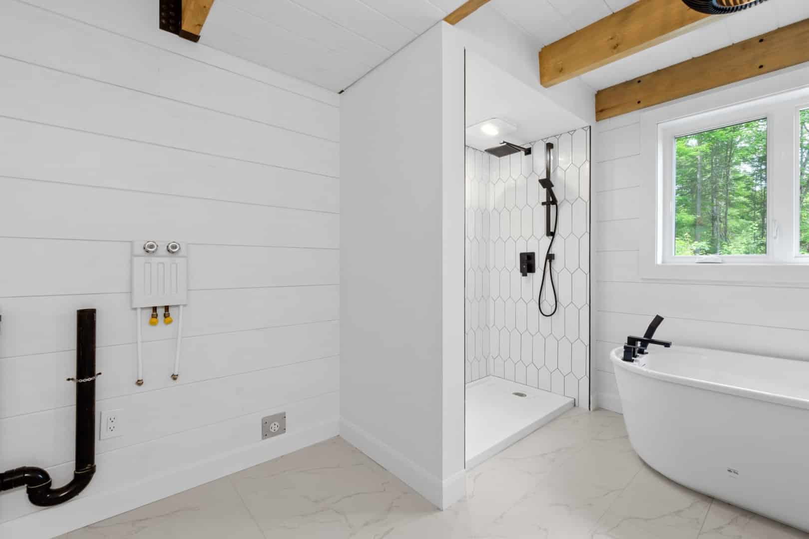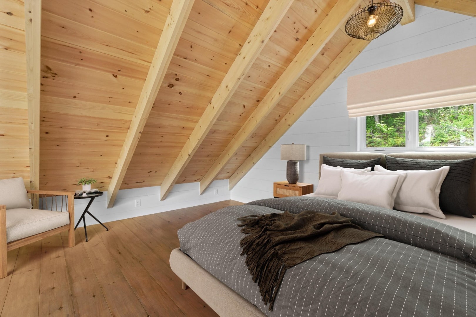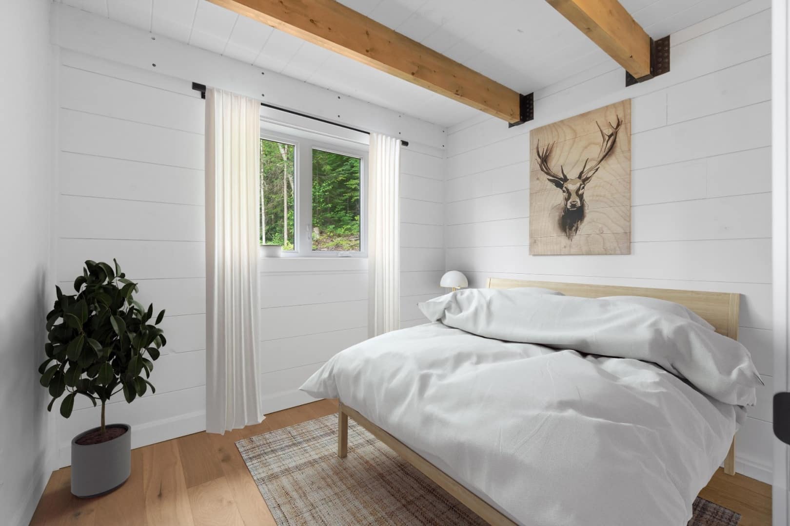 Grandeur: 24′ x 24′ Isolation: R-24.5 Fini extérieur: Plat Hauteur des murs: 9′ 1″ Poutre apparentes: Oui