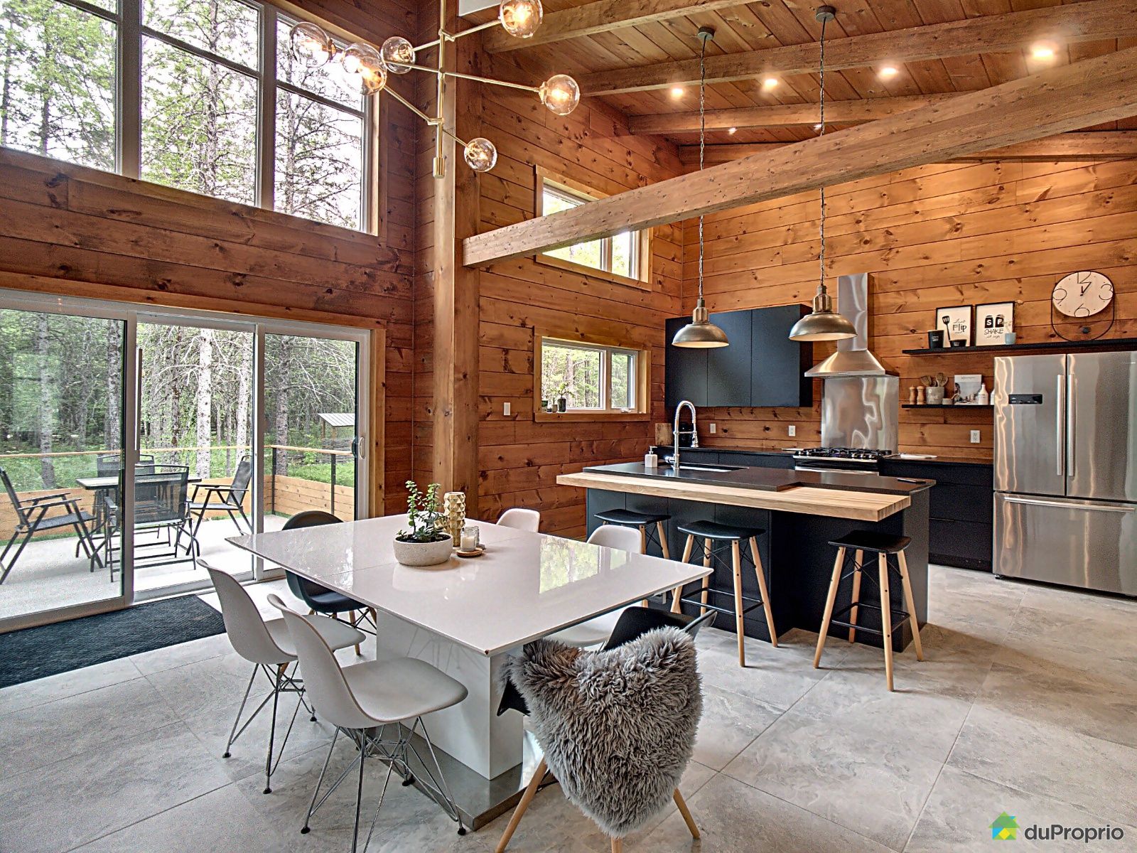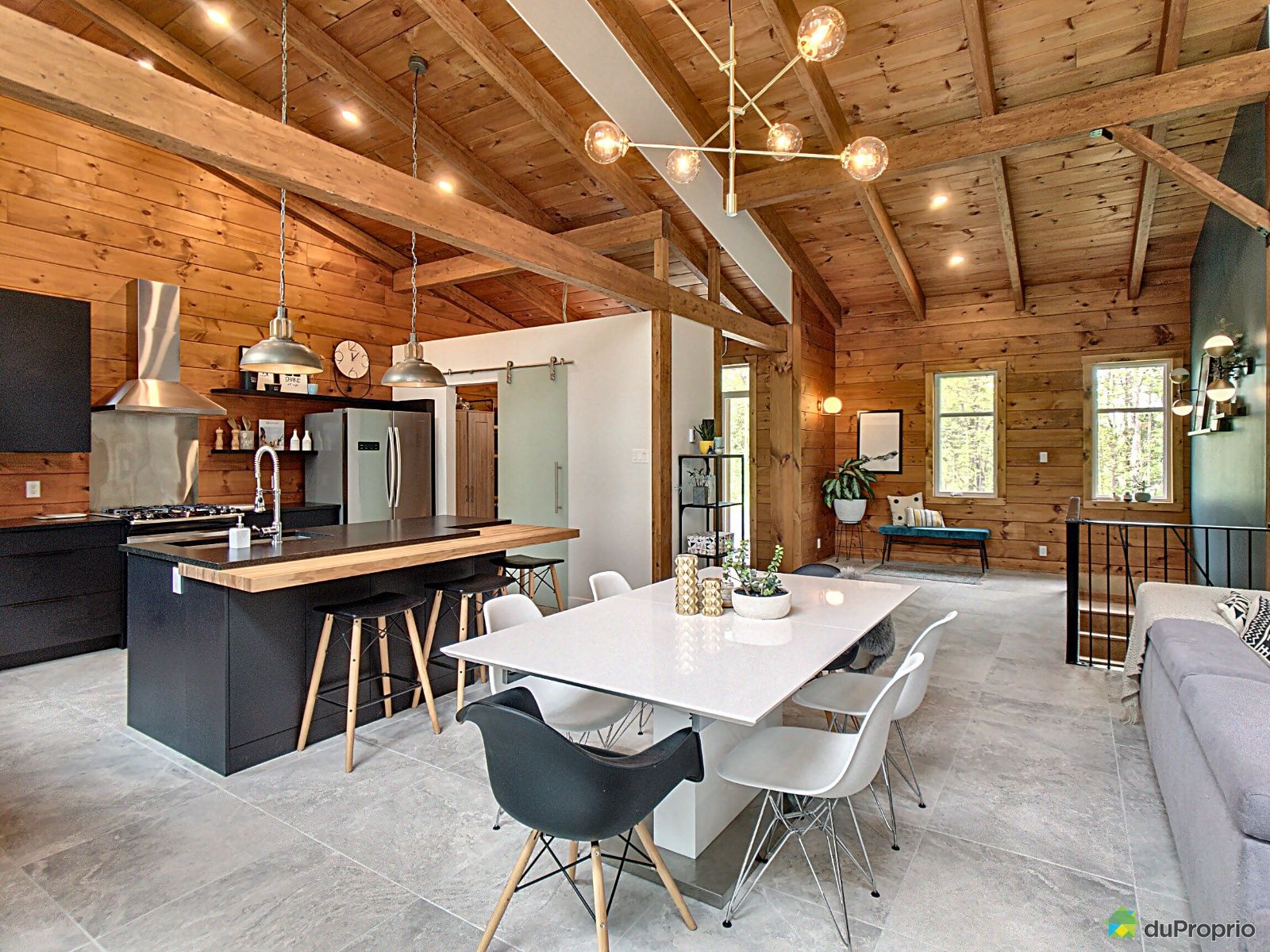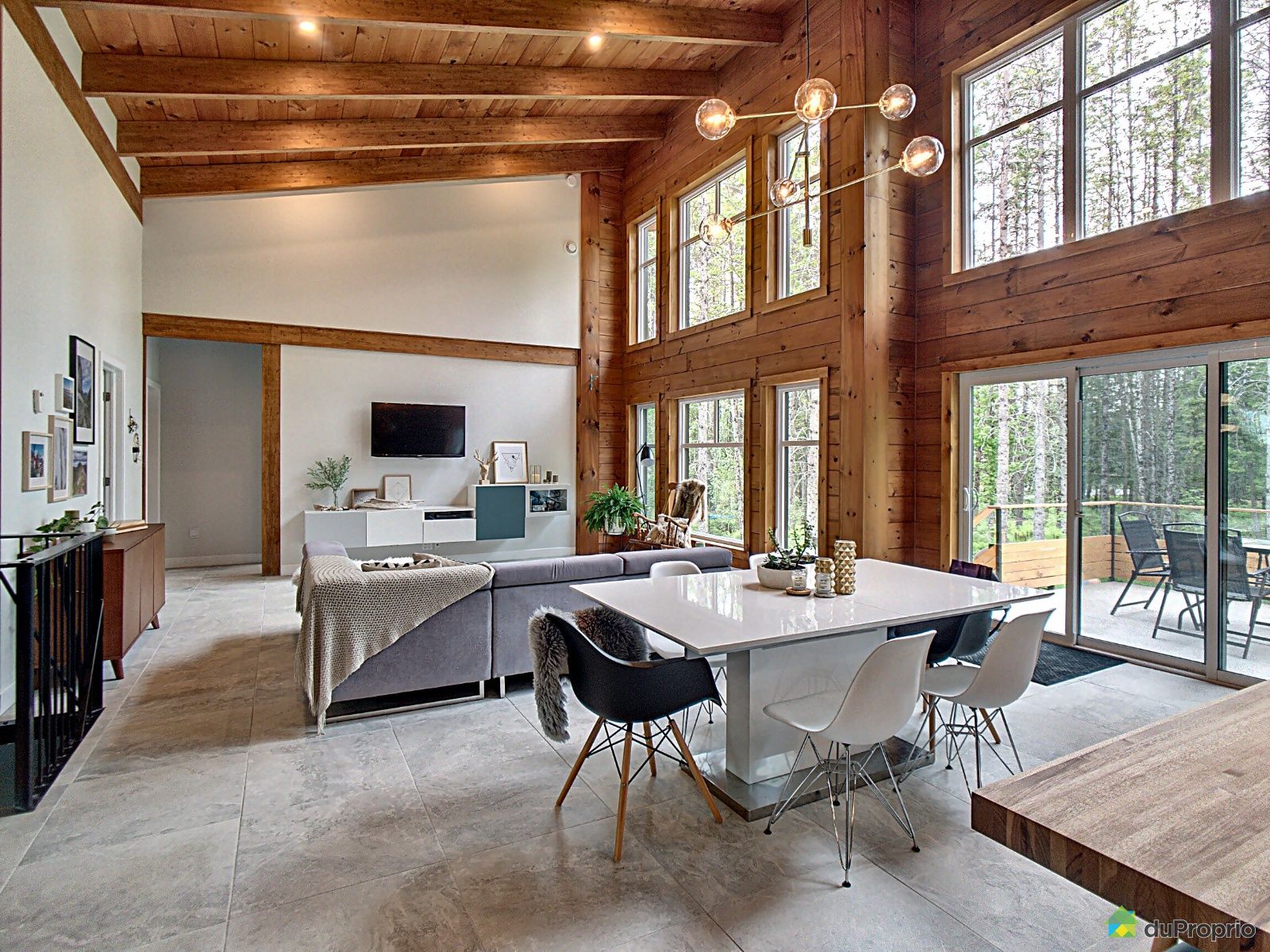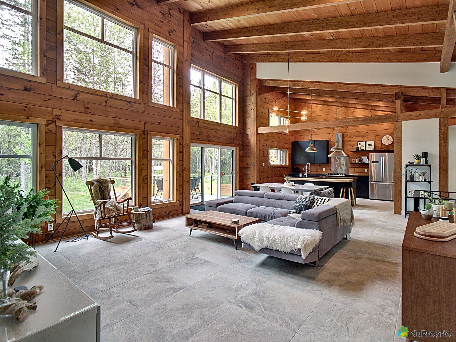 Maison écoénergétique à conception unique; charpente pièce-sur-pièce, utilisant la technologie thermalog (isolo-rondin, produits-boreal-strip.dev2.wshost.ca). Mur isolé R-30 et toiture R-45, ossature avec poutre apparente en bois massif, plafond cathédrale de 20 pieds, aire ouverte spacieuse, grande fenestration dirigée vers la cour arrière. Style intérieur d’inspiration scandinave.