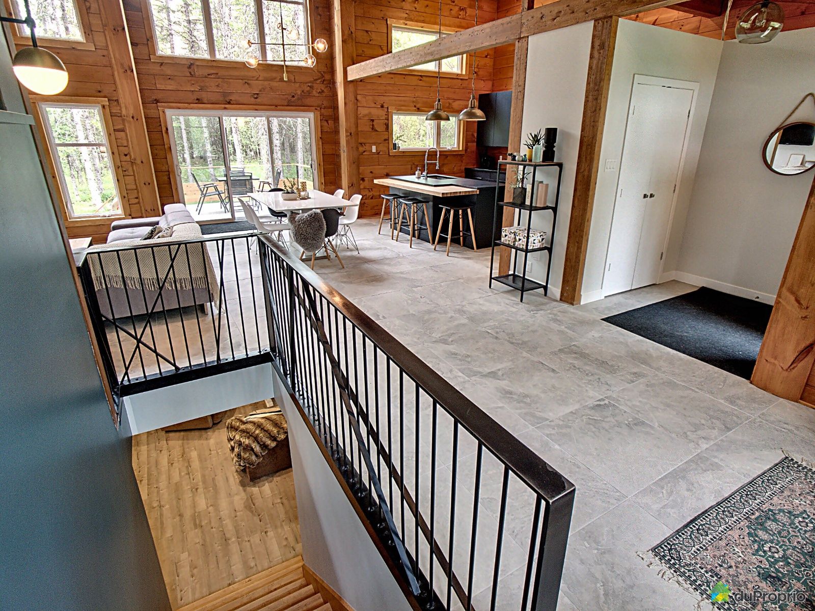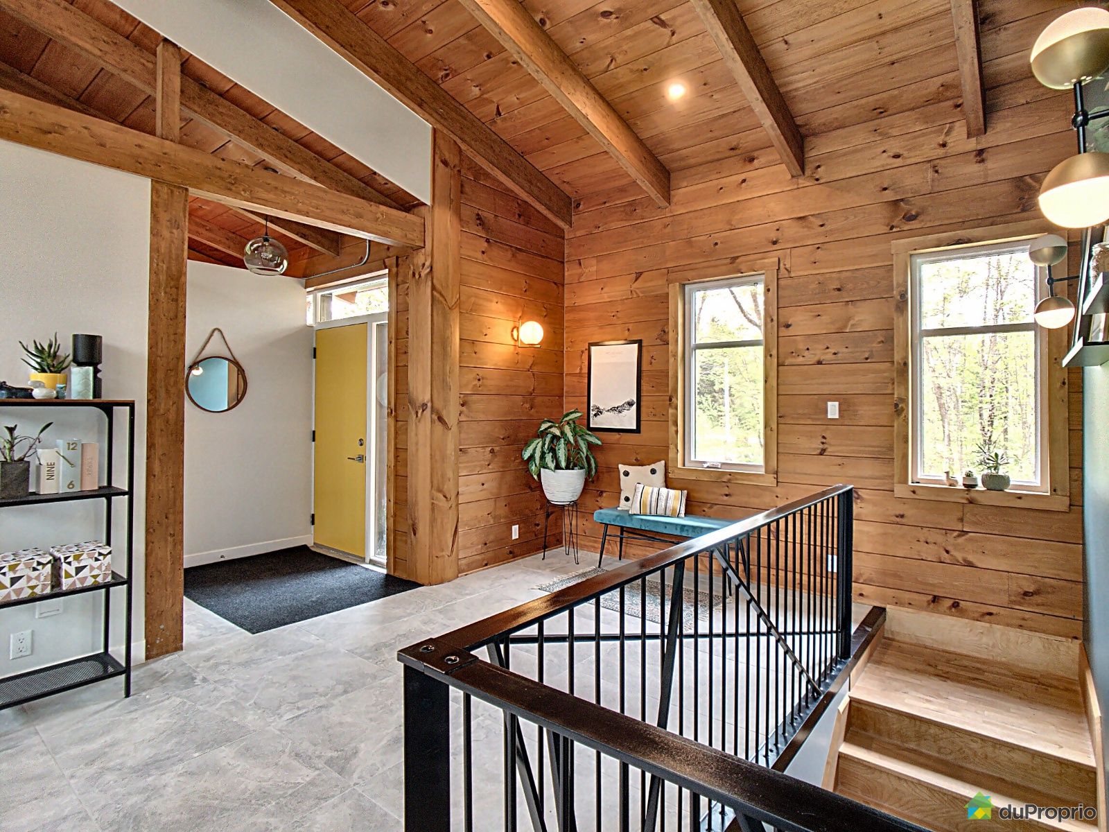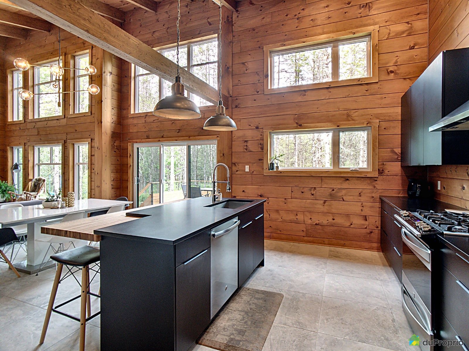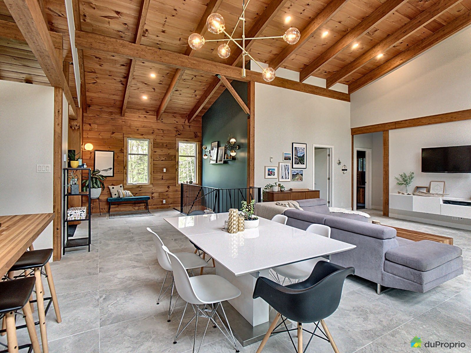 Maison écoénergétique à conception unique; charpente pièce-sur-pièce, utilisant la technologie thermalog (isolo-rondin, produits-boreal-strip.dev2.wshost.ca). Mur isolé R-30 et toiture R-45, ossature avec poutre apparente en bois massif, plafond cathédrale de 20 pieds, aire ouverte spacieuse, grande fenestration dirigée vers la cour arrière. Style intérieur d’inspiration scandinave.
