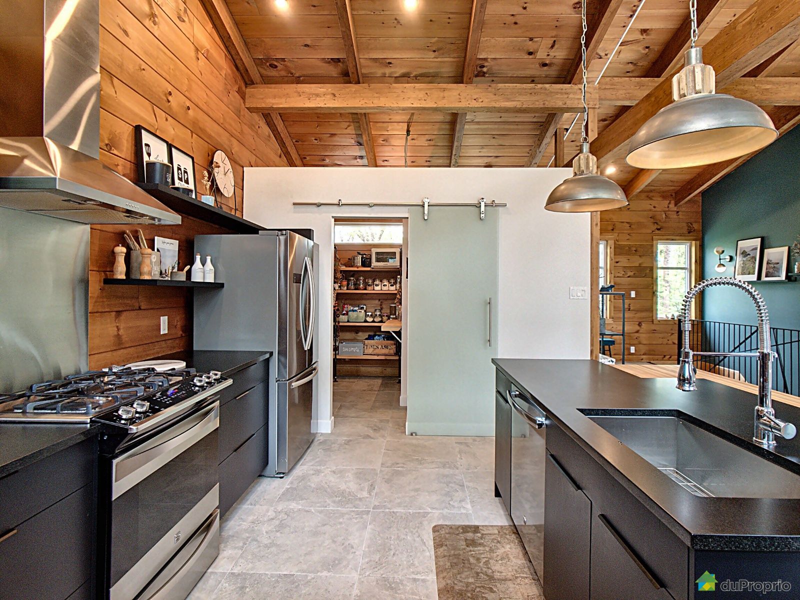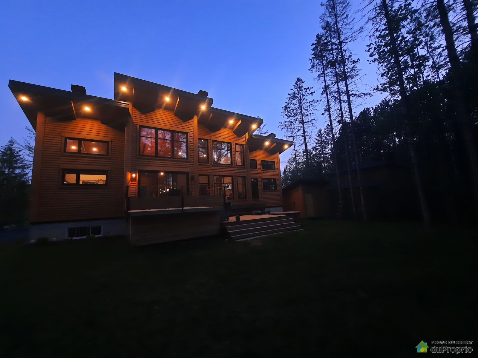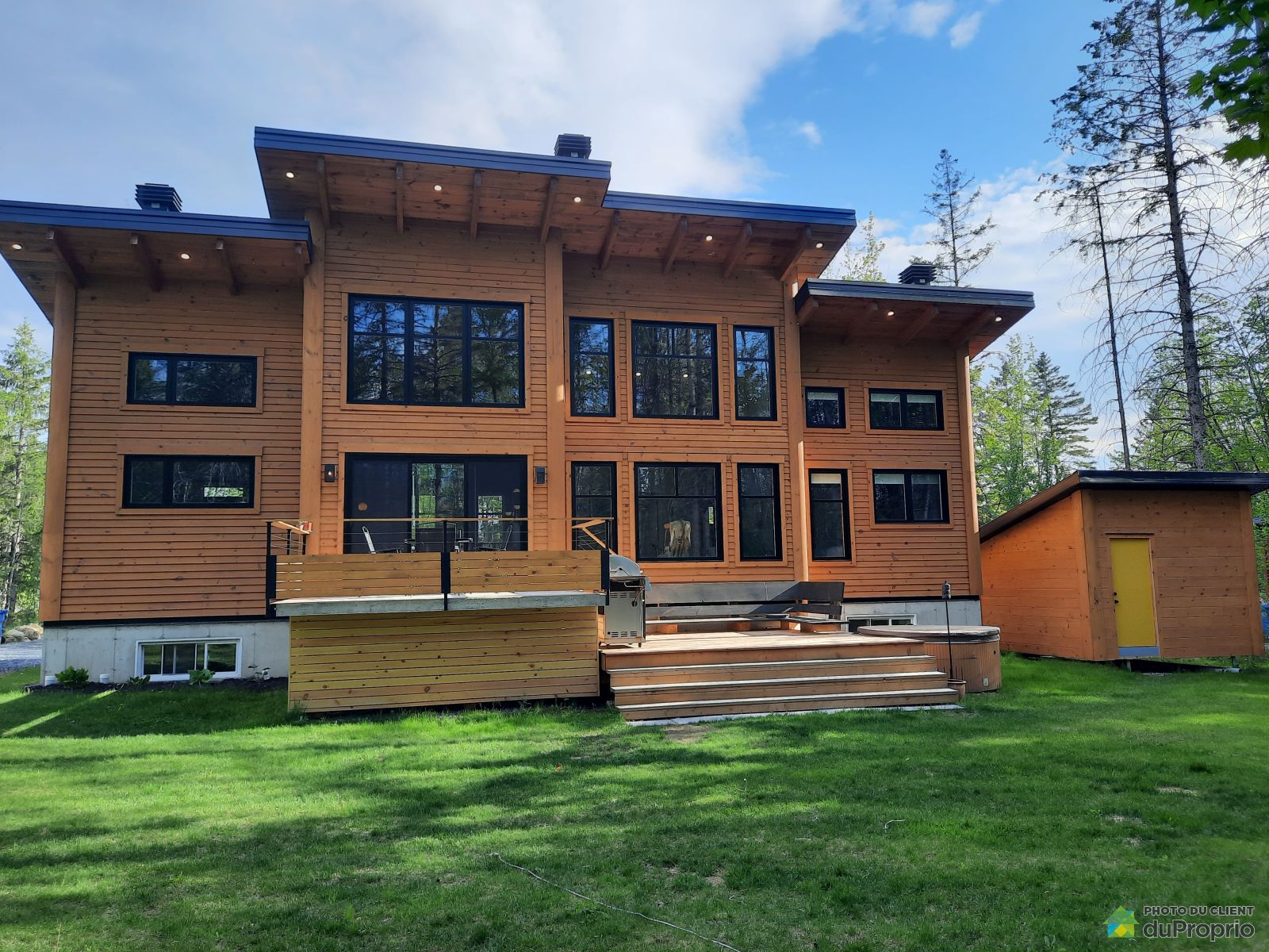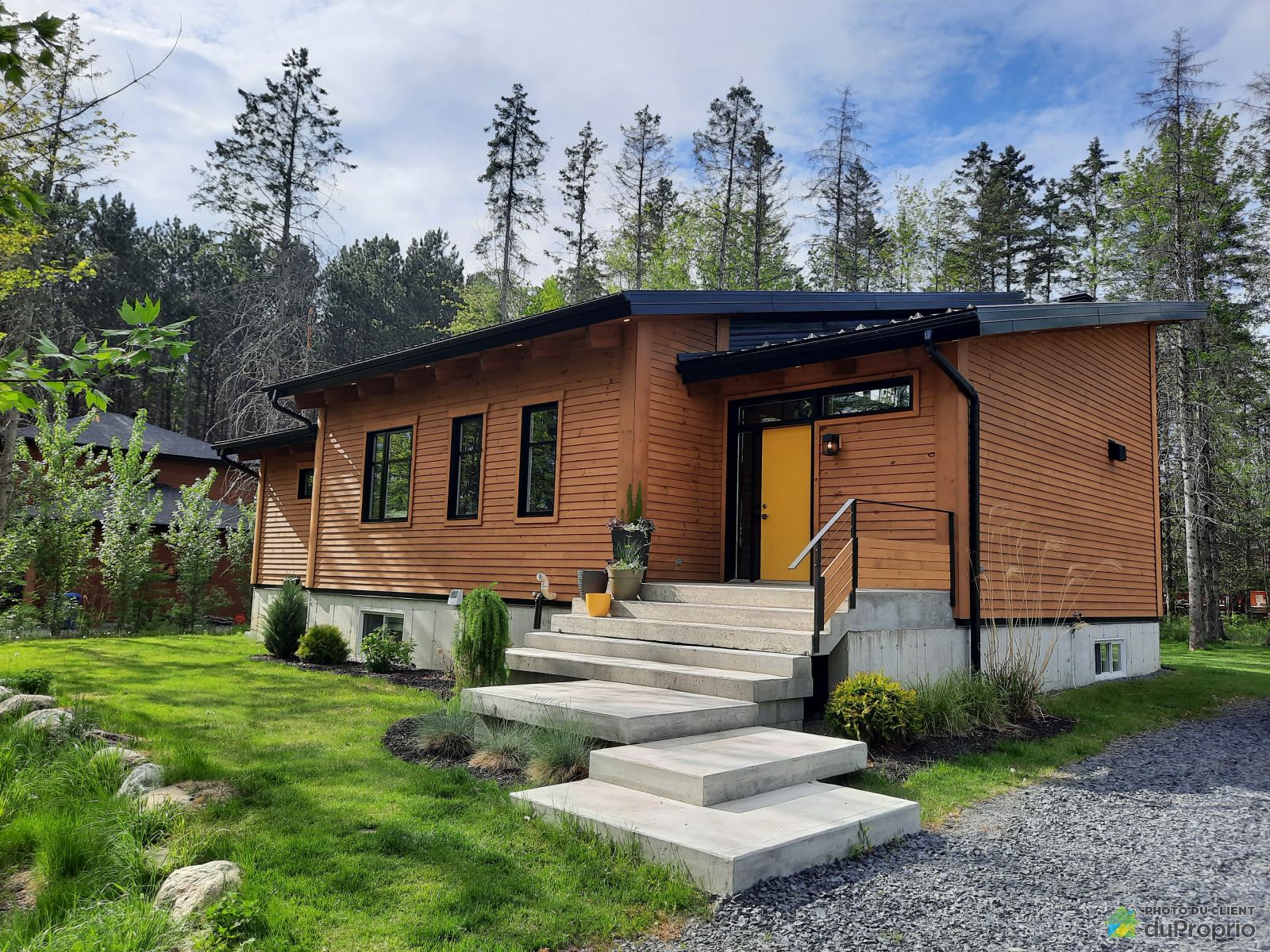 Maison écoénergétique à conception unique; charpente pièce-sur-pièce, utilisant la technologie thermalog (isolo-rondin, produits-boreal-strip.dev2.wshost.ca). Mur isolé R-30 et toiture R-45, ossature avec poutre apparente en bois massif, plafond cathédrale de 20 pieds, aire ouverte spacieuse, grande fenestration dirigée vers la cour arrière. Style intérieur d’inspiration scandinave.