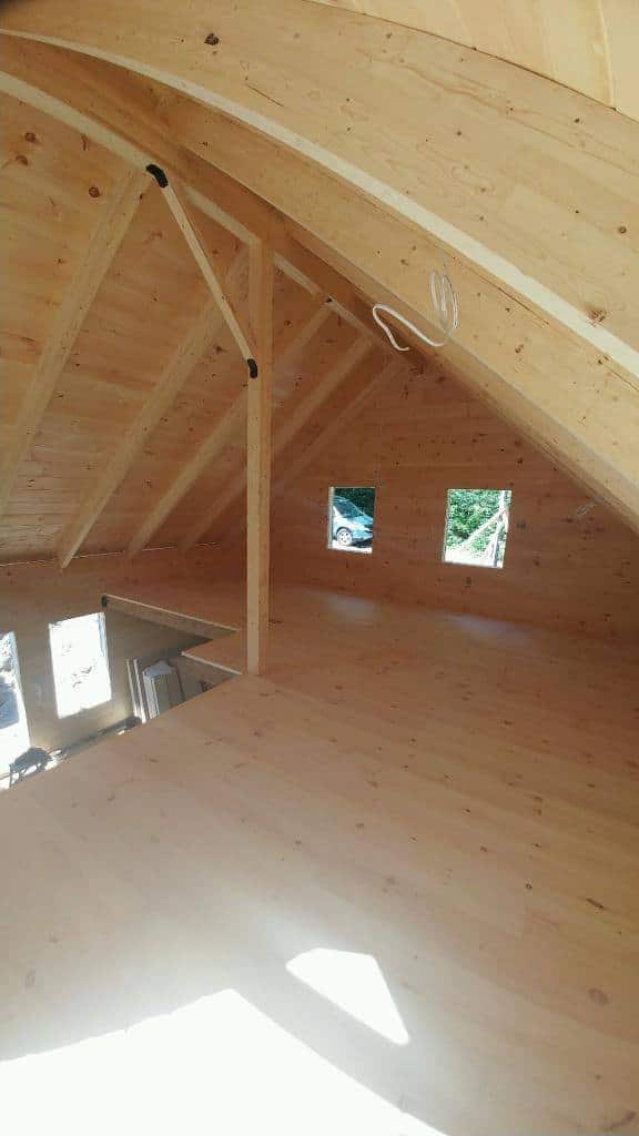 Grandeur: 28′ x 24′ Isolation: R-24,5 Fini extérieur: Plat Hauteur des murs: 9’10′′ Poutre apparentes: Oui