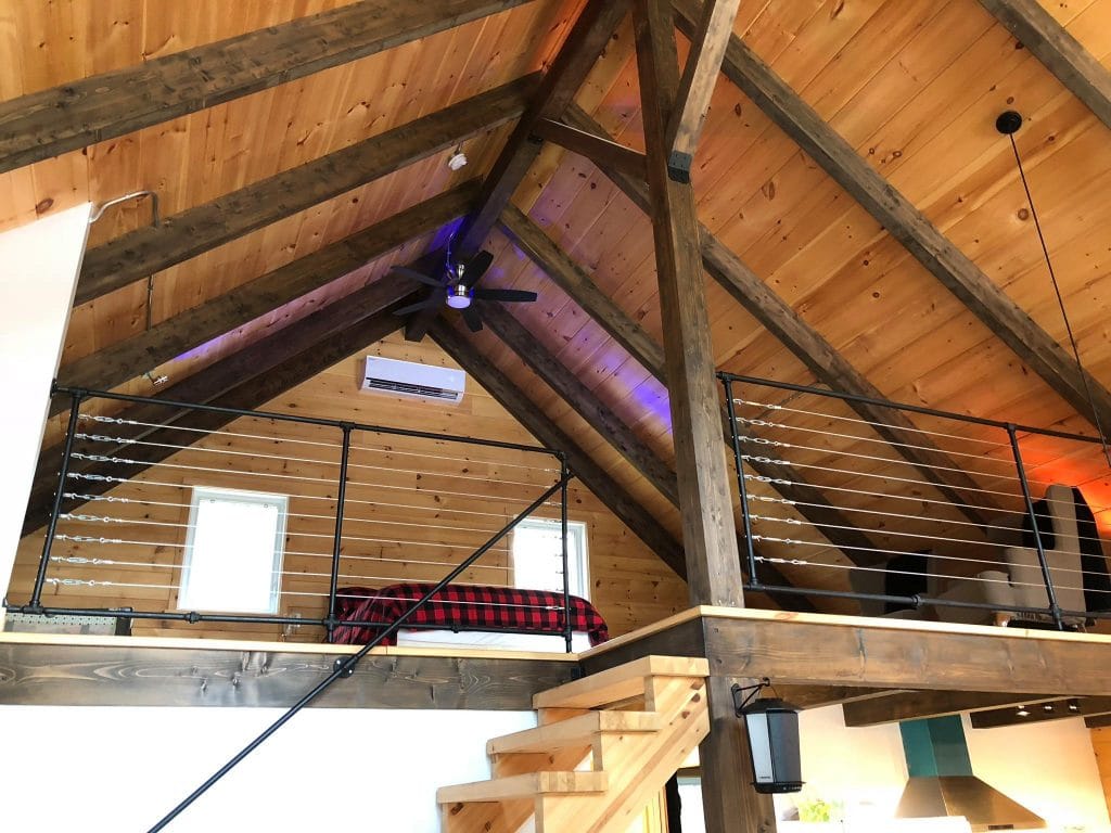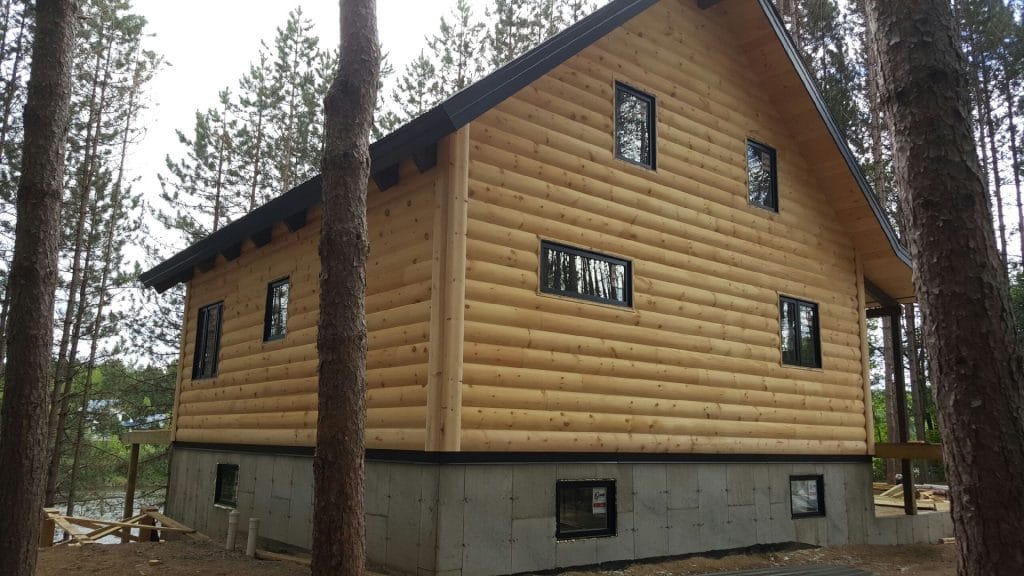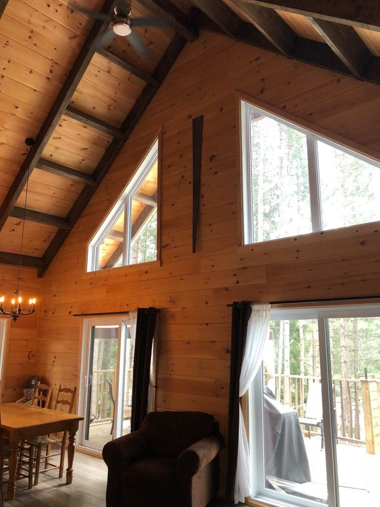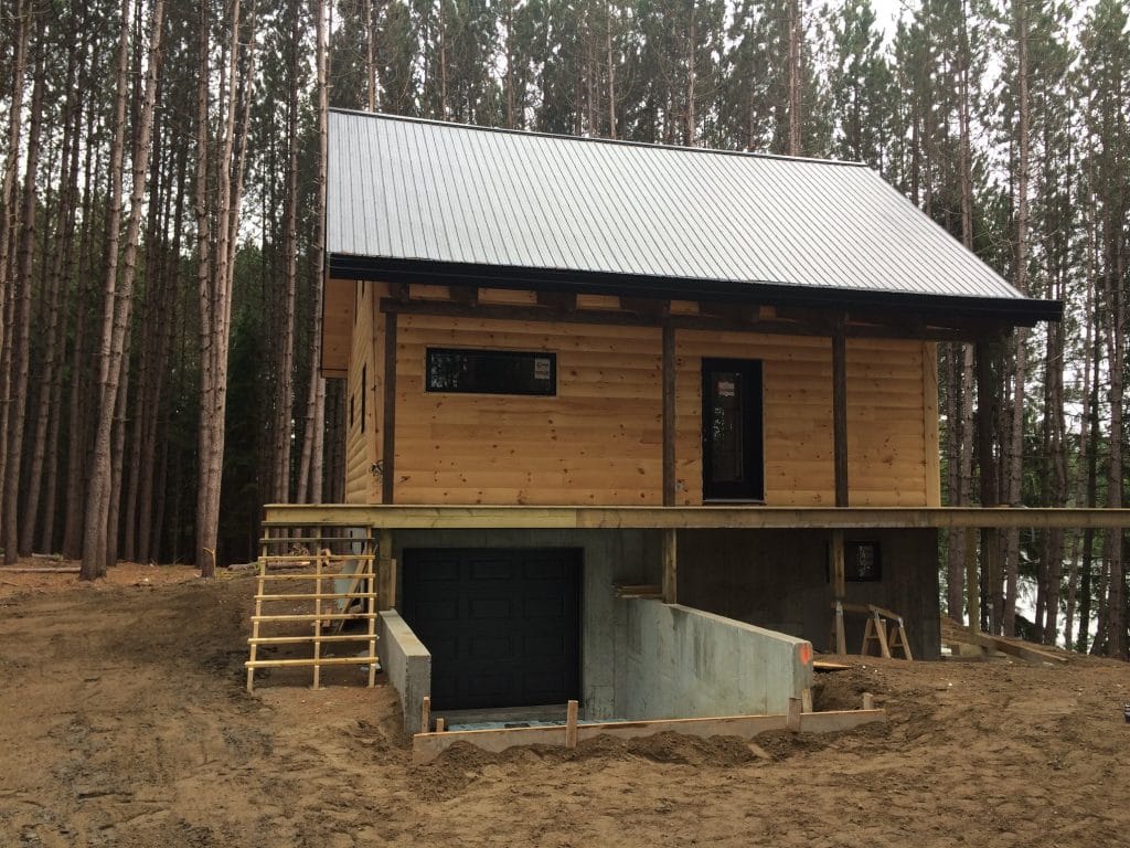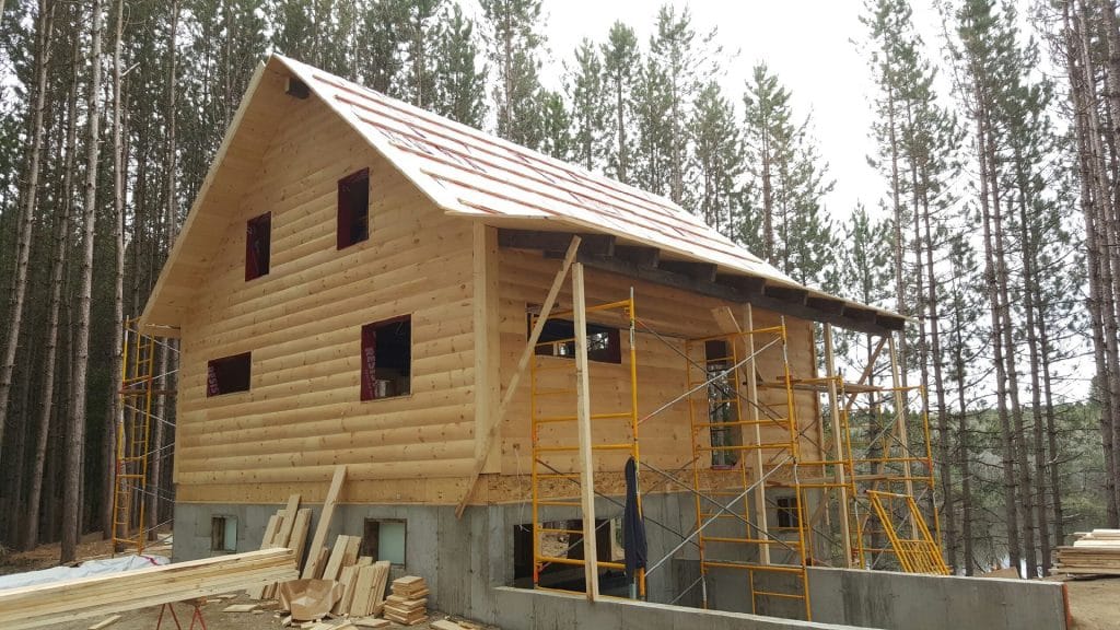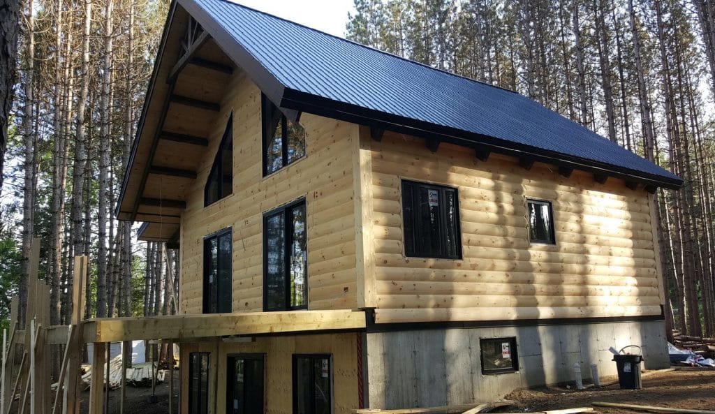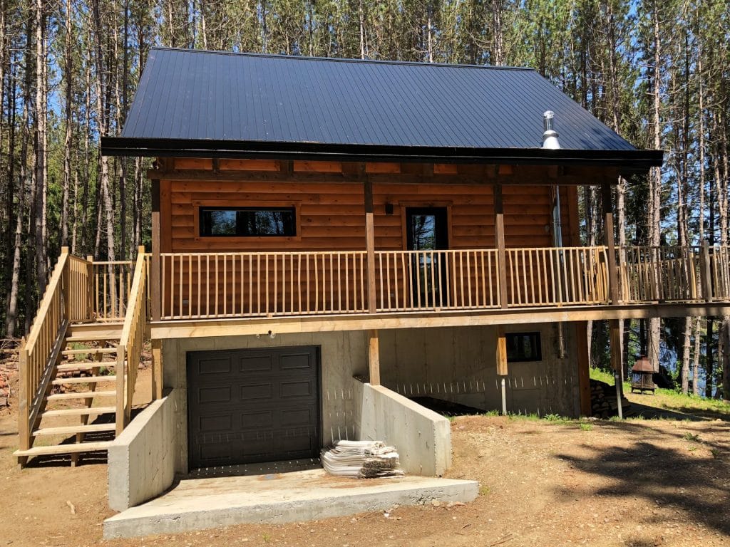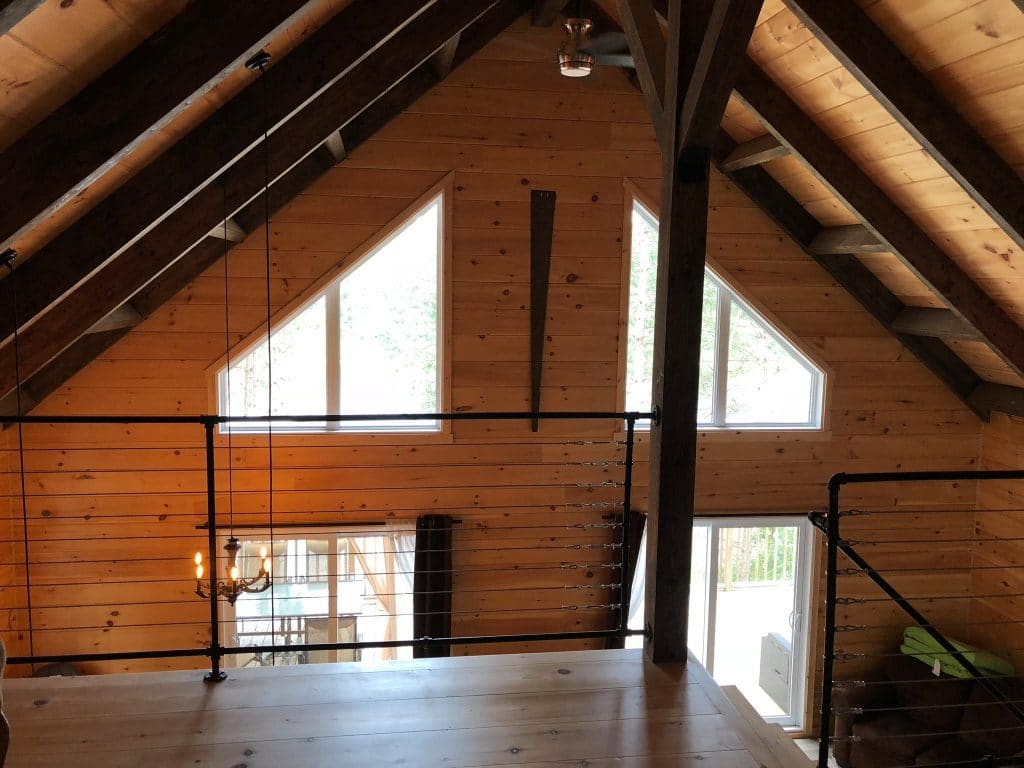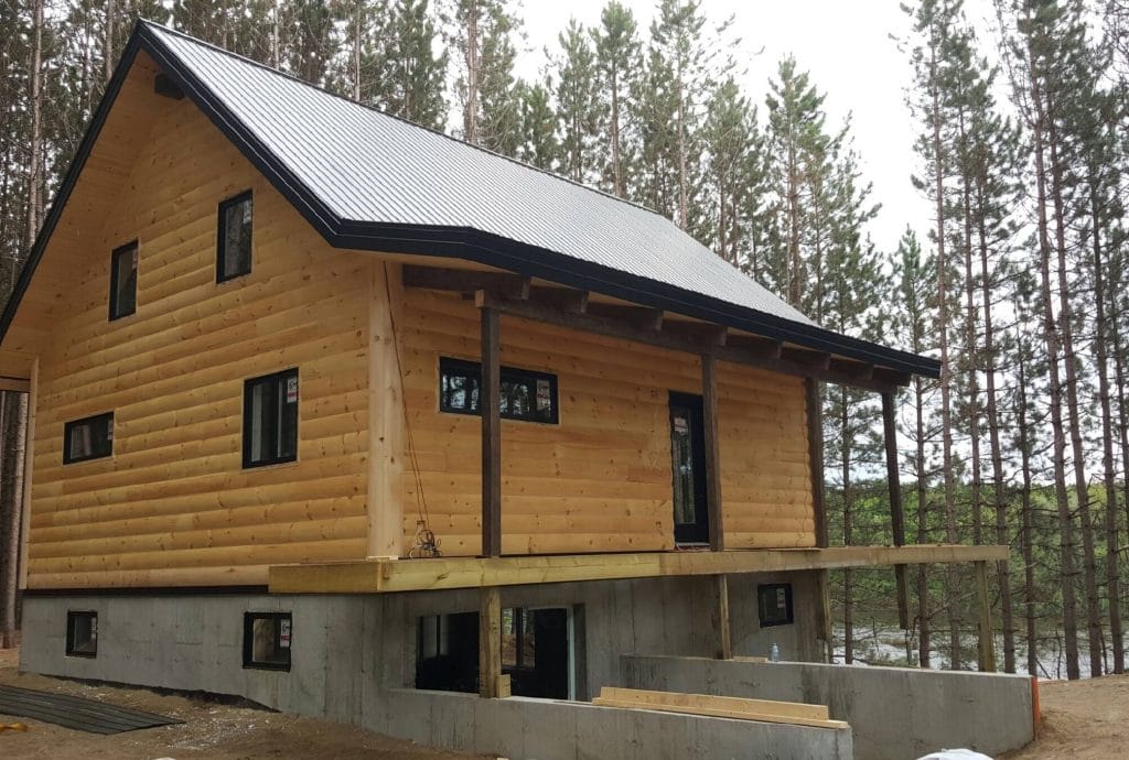 Grandeur: 28′ x 28′ Fini extérieur: Rond Hauteur des murs: 10′ Poutre apparentes: Oui Extra: Mezzanine 1/2
