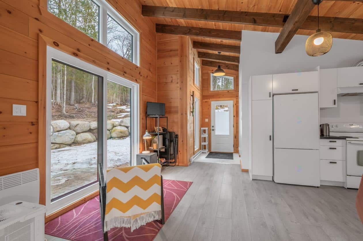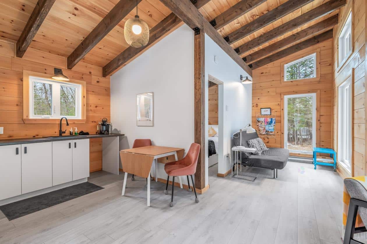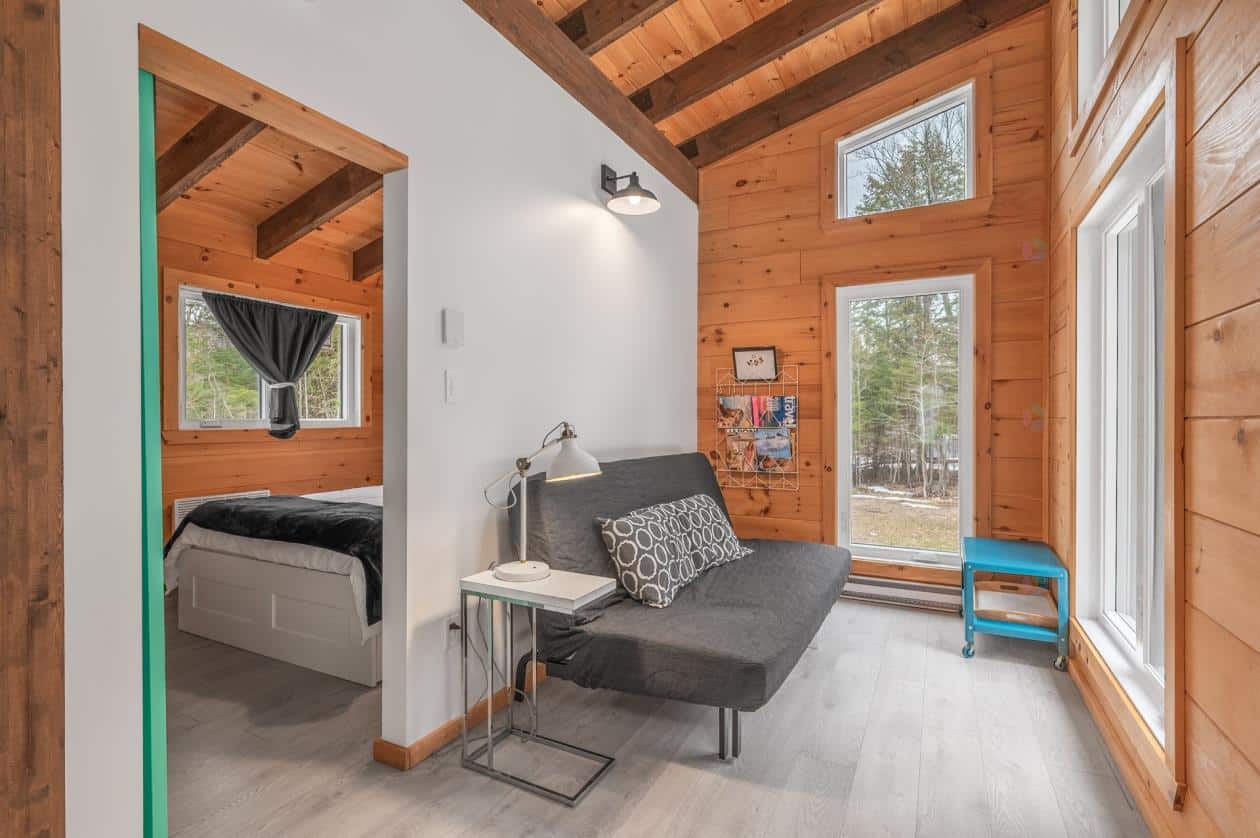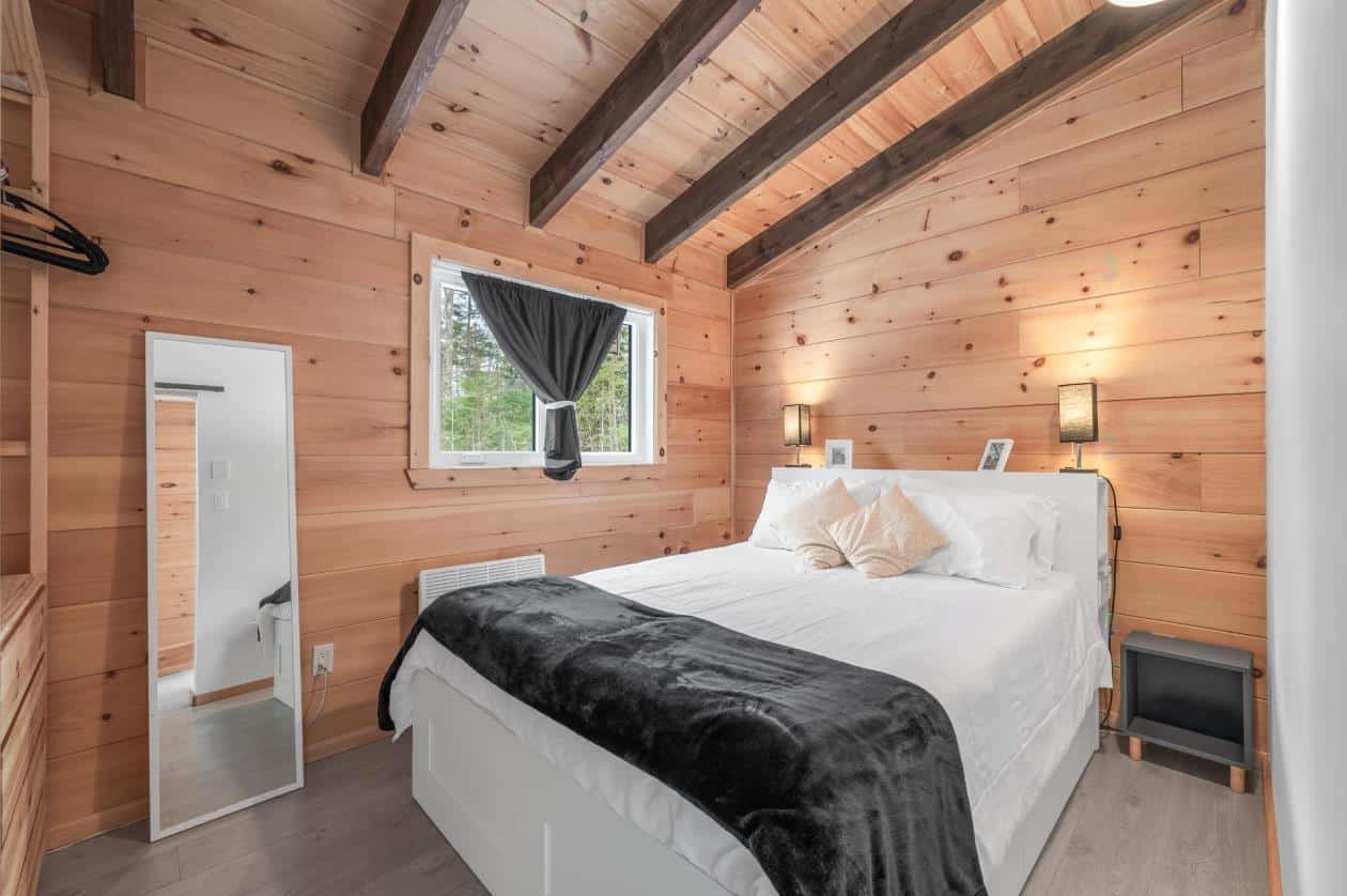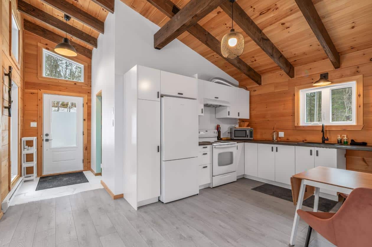 Grandeur: 32′ x 20′ Isolation: R-24.5 Fini extérieur: Plat Hauteur des murs: 14′ Facade, 8’3″ Arrière Poutre apparentes: Oui