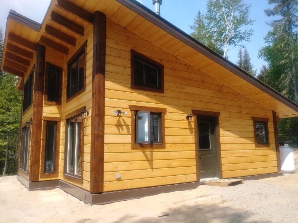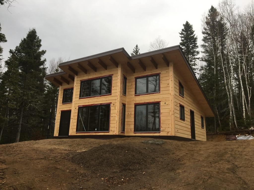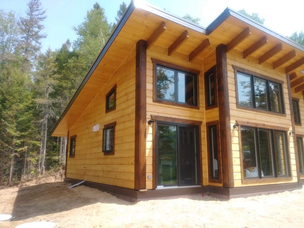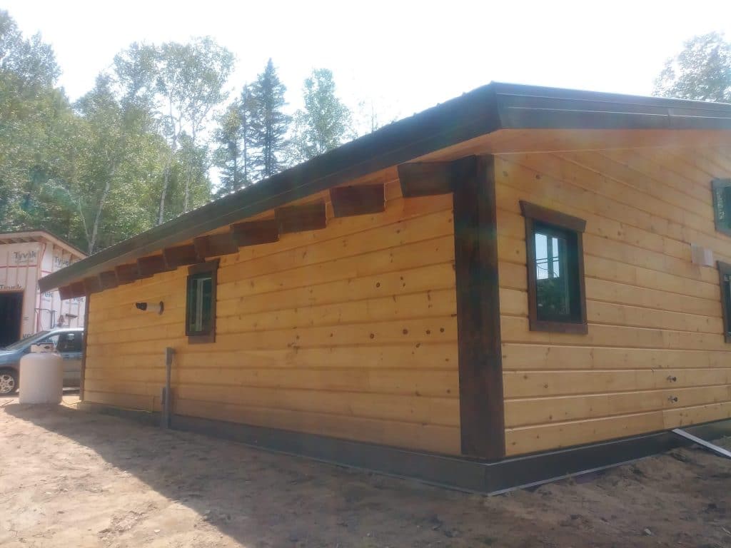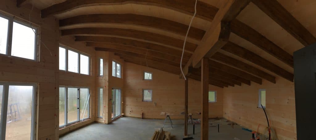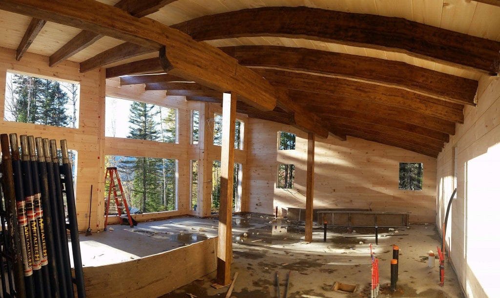 Grandeur: 34′ x 29′ Fini extérieur: Plat Hauteur des murs: 15′ avant et 8’3″ arrière Poutre apparentes: Oui