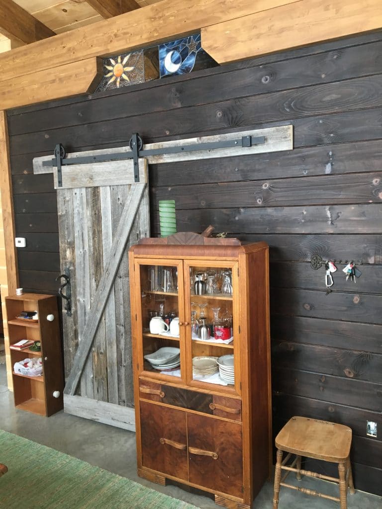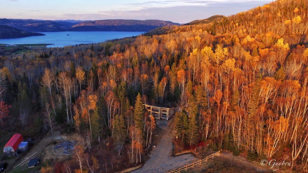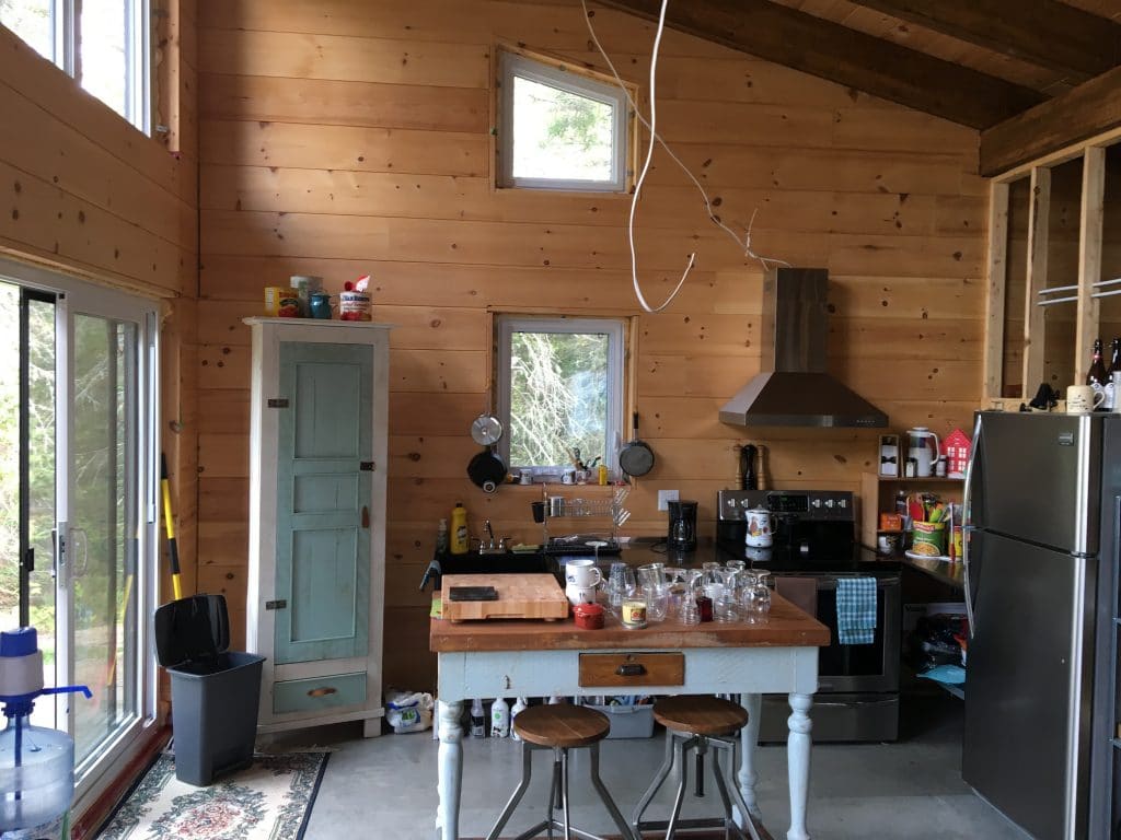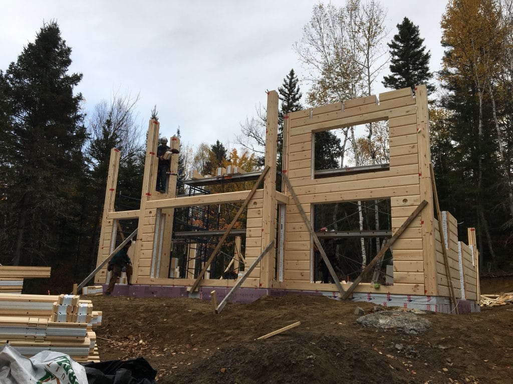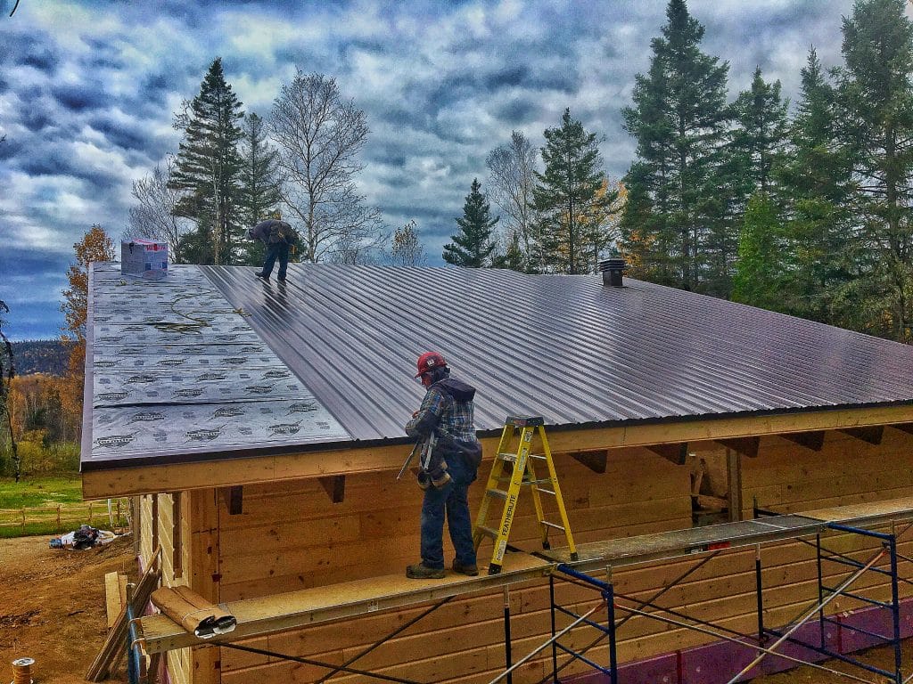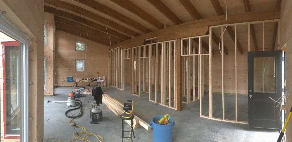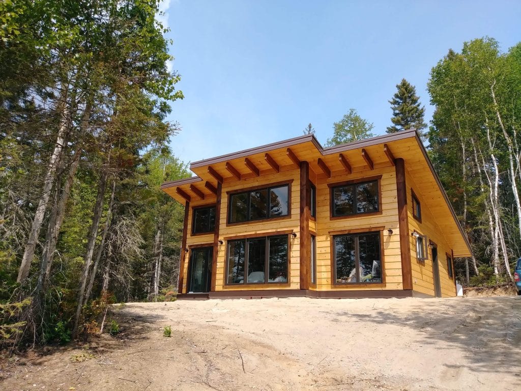 Grandeur: 34′ x 29′ Fini extérieur: Plat Hauteur des murs: 15′ avant et 8’3″ arrière Poutre apparentes: Oui