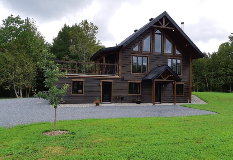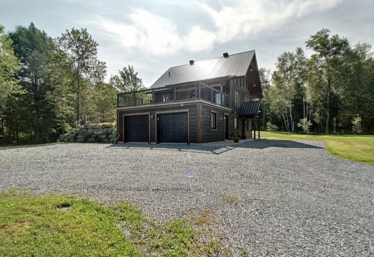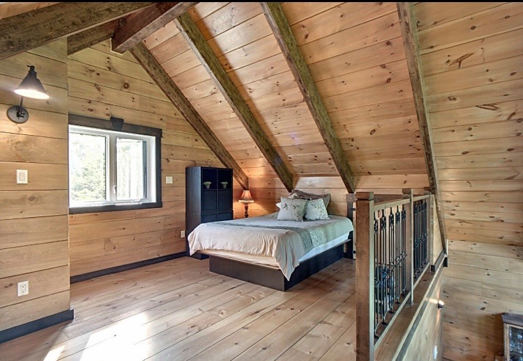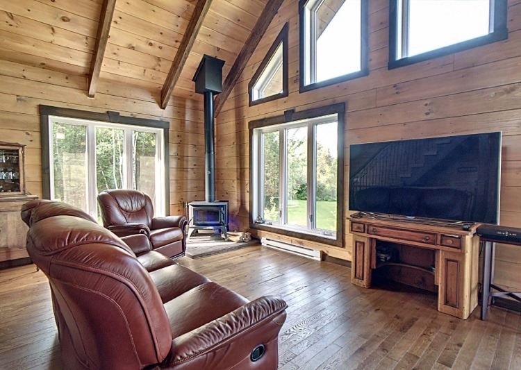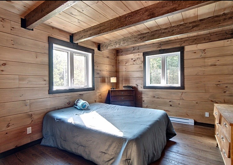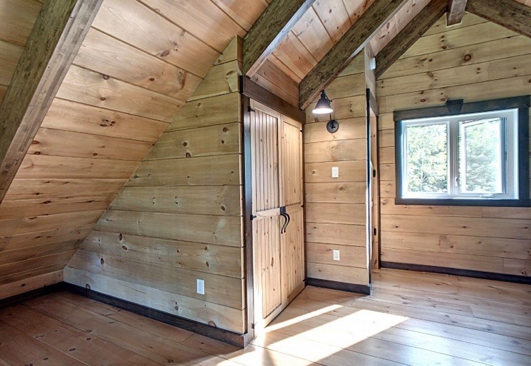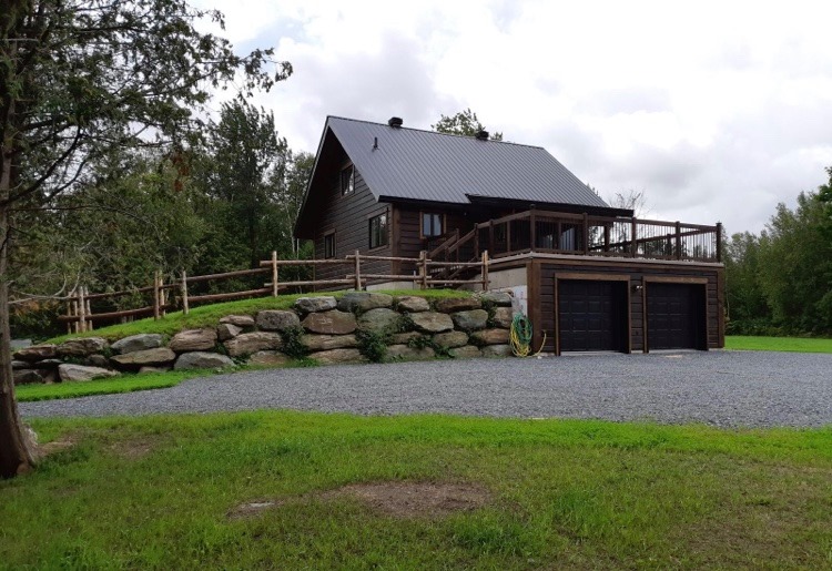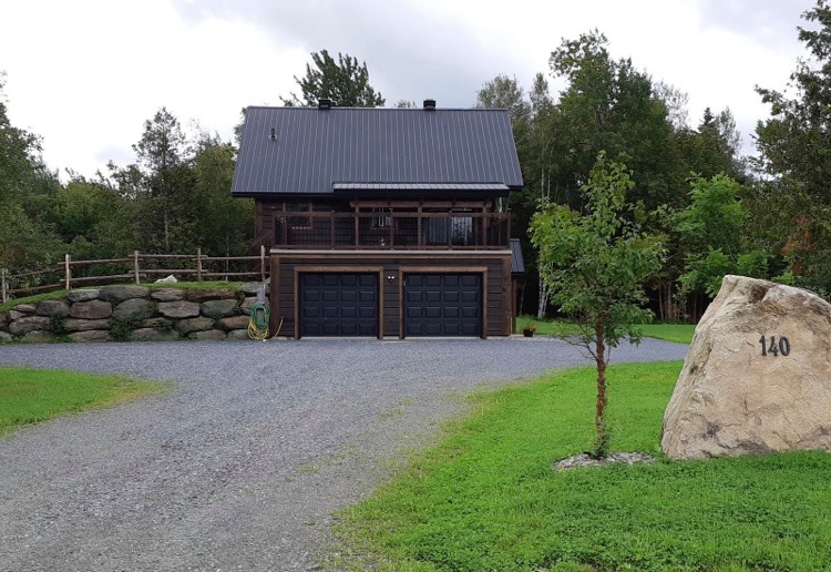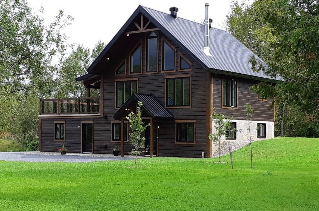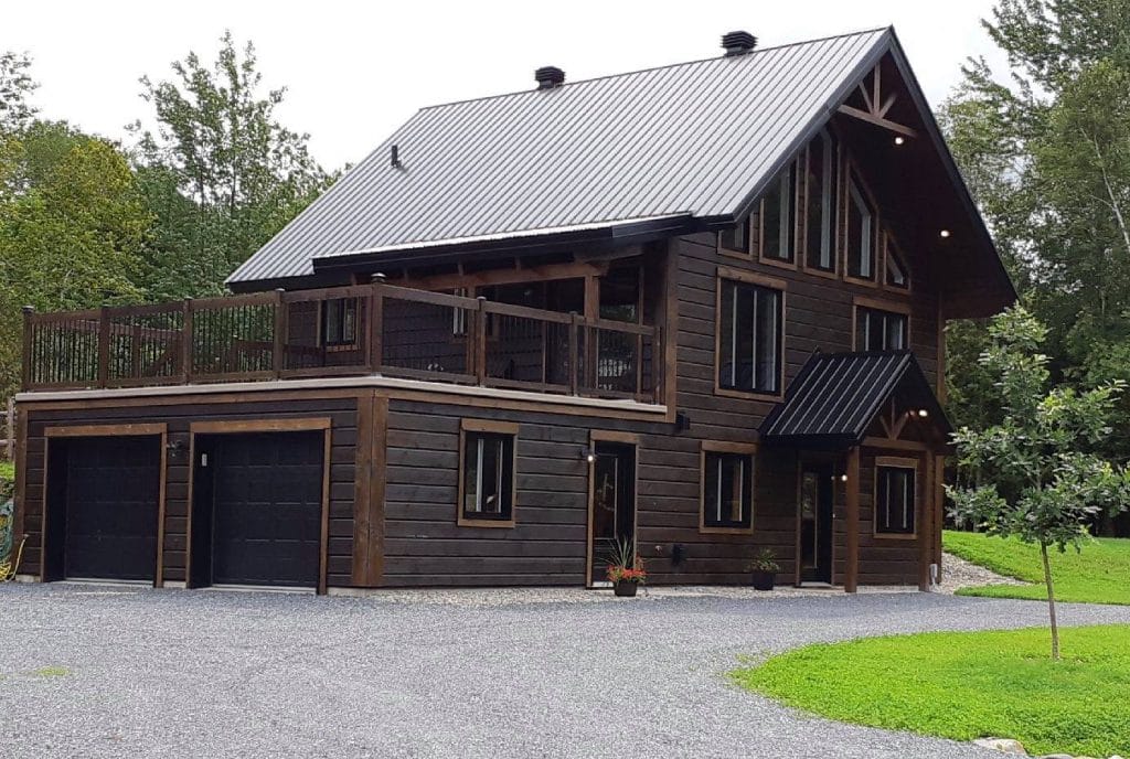 Intégration d’un garage double avec du revêtement de pin Boréal