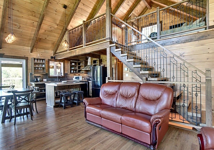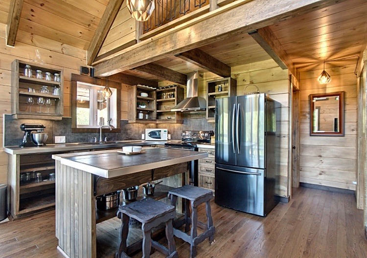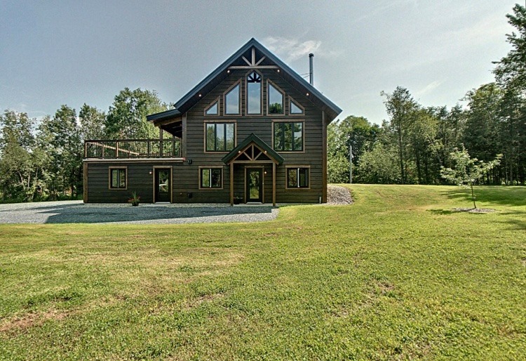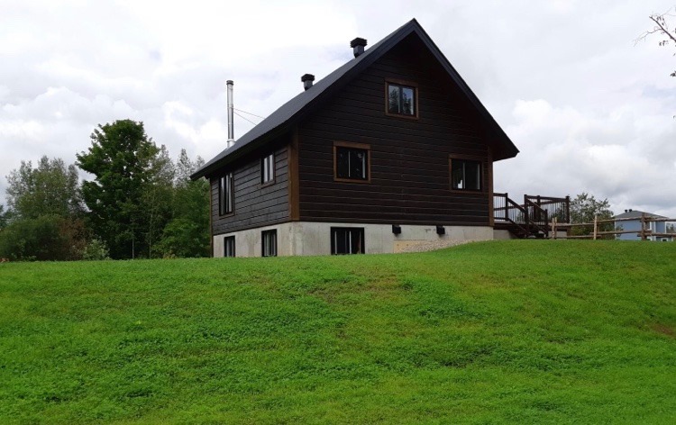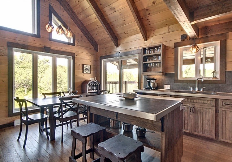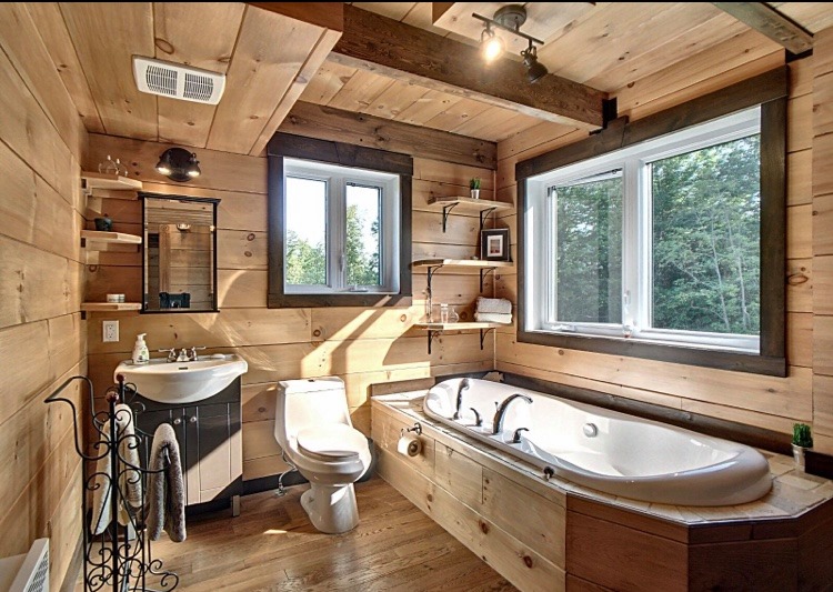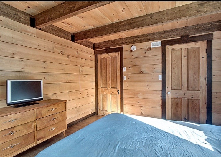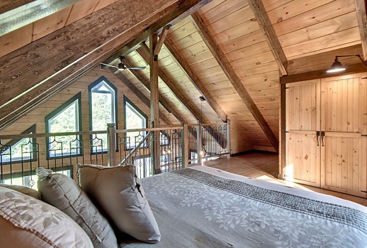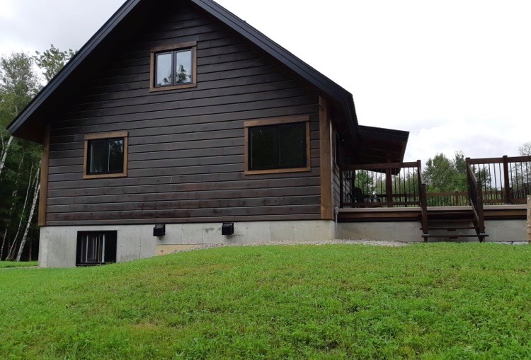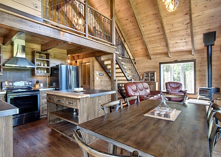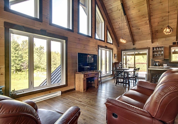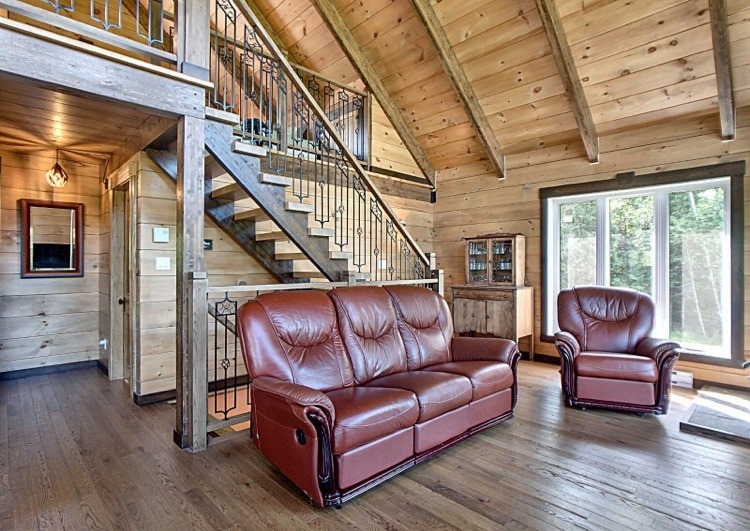 Intégration d’un garage double avec du revêtement de pin Boréal