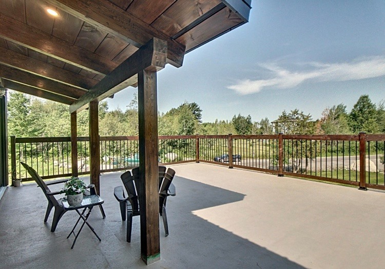 Porche en poutres apparentes devant la façade du rez-de-jardin
