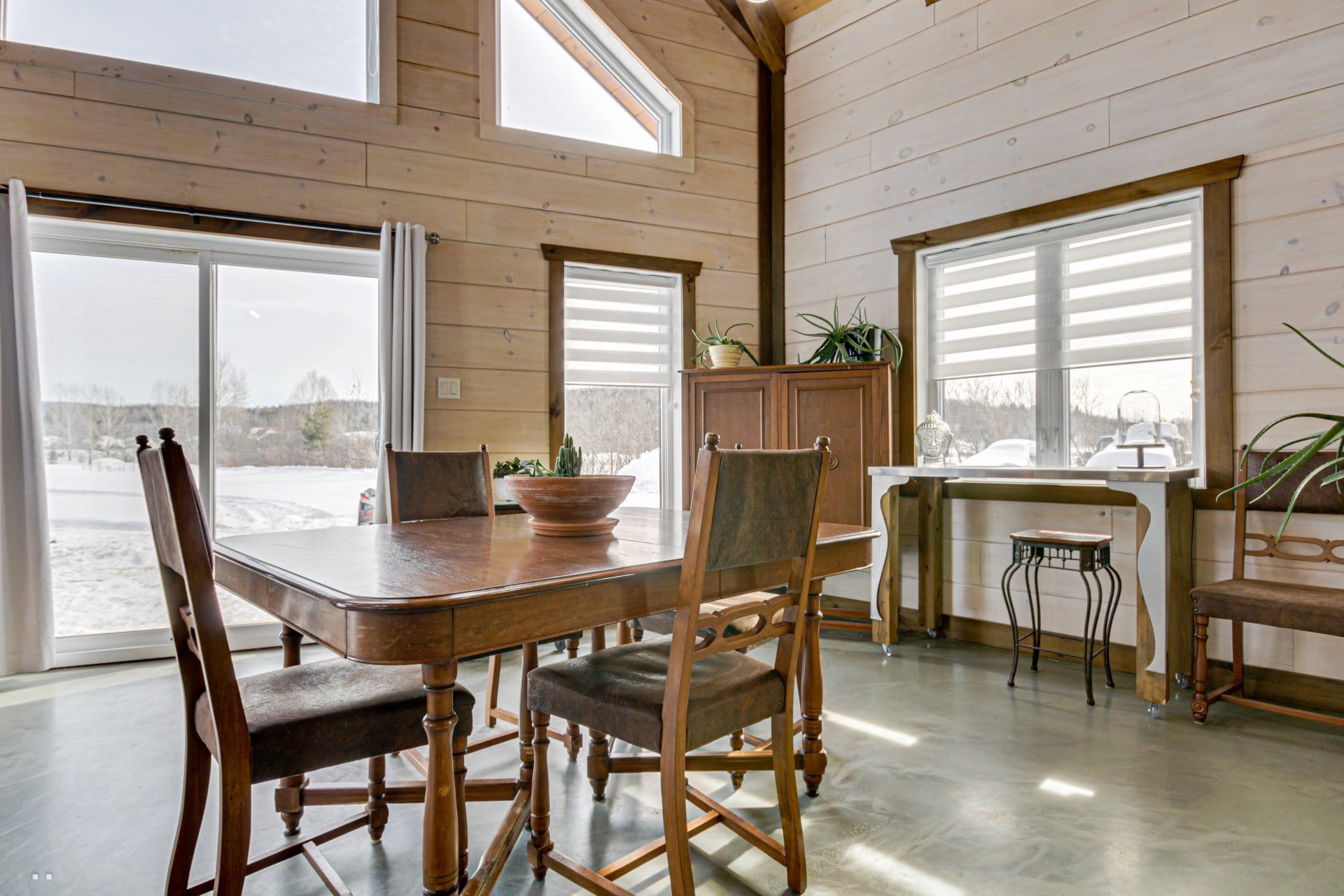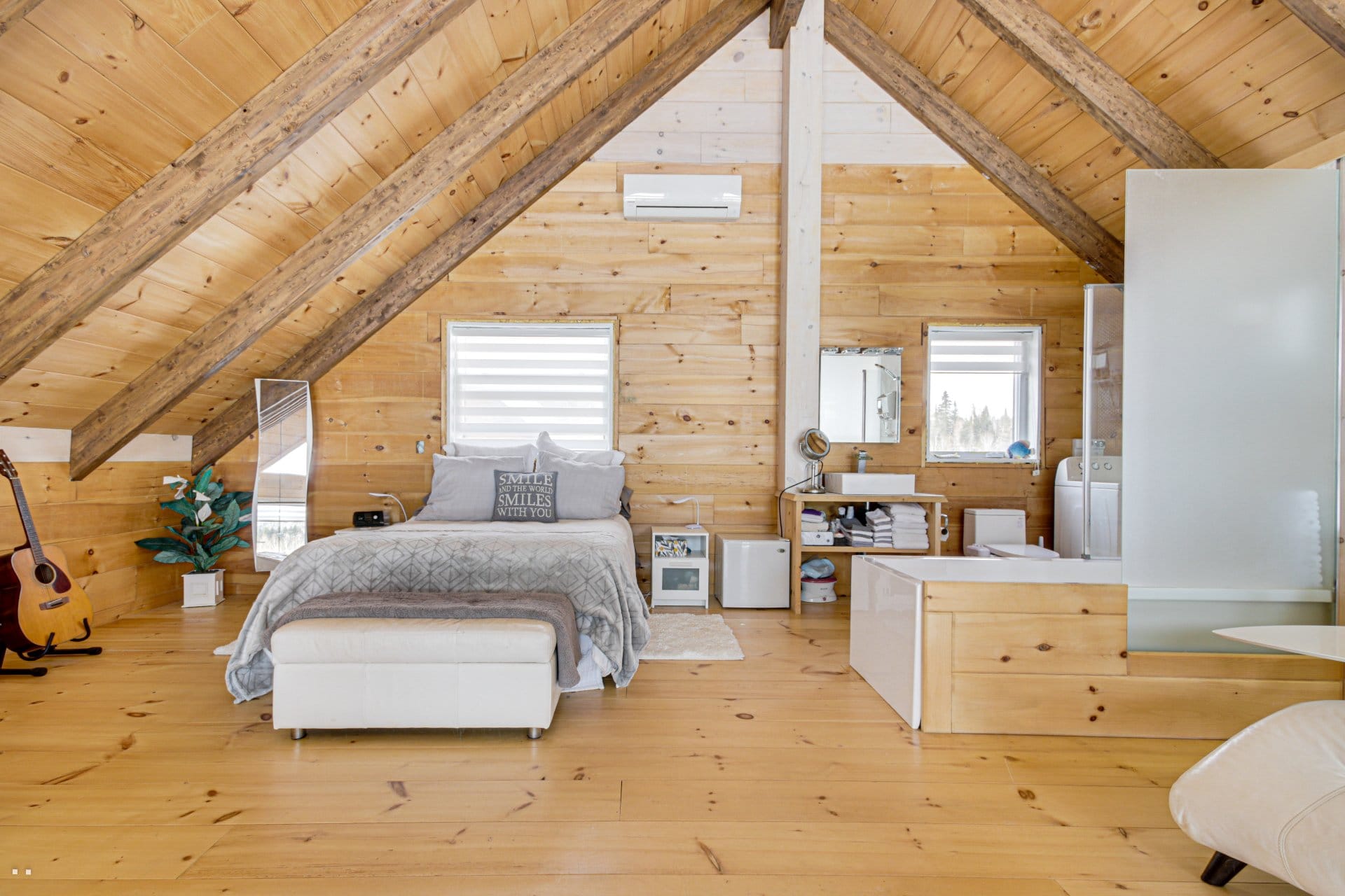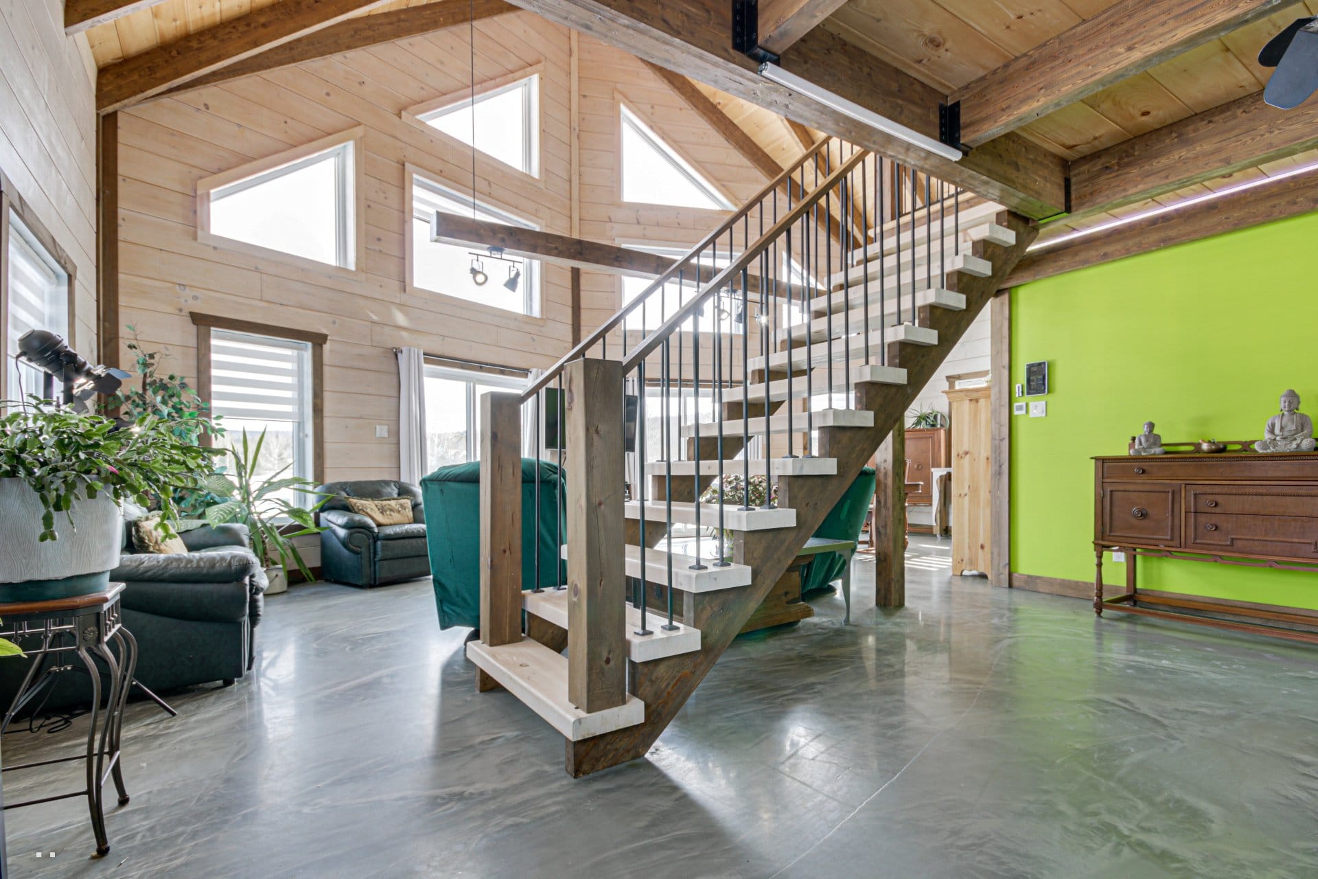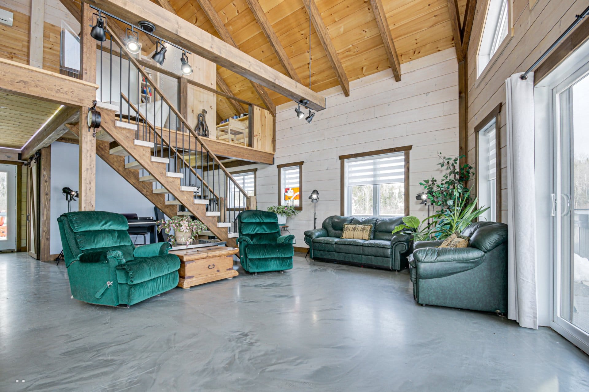 Grandeur: 30′ x 35′ + garage Isolation: R-30 Fini extérieur: Rond Hauteur des murs: 10′ Poutre apparentes: Oui